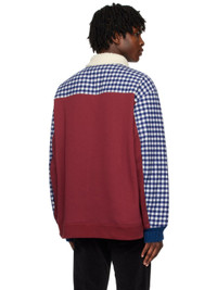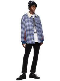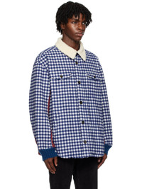 Paneled cotton flannel and cotton jersey jacket. Raw edges and check pattern throughout. · Sherpa fleece spread collar · Button closure · Flap and welt pockets · Shirttail hem · Rib knit cuffs · Elasticized back hem · Partial quilted satin lining Supplier color: Navy check