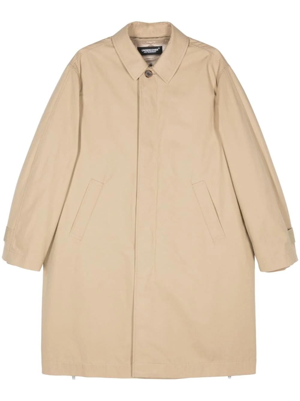 logo-print coat Highlights - Beige - Cotton - Textured finish - Logo print to the rear - Concealed front button fastening - Classic collar - Long sleeves - Buttoned cuffs - Two side welt pockets - Partial lining - Straight hem - Mid-length Imported Composition Lining: Nylon 100%, Polyester 100%, Acrylic 70%, Wool 30% Outer: Cotton 100% Washing instructions Dry Clean Only