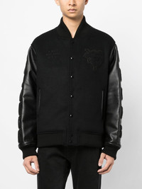 patch-detail buttoned bomber jacket Highlights - Black - Wool blend - Front button fastening - Patch detail - Two front welt pockets - Band collar - Long sleeves - Ribbed cuffs and hem Imported Composition Filling: Polyester 100% Lining: Cupro 100% Outer: Wool 96%, Nylon 4% Acrylic 70%, Wool 30% SIZE & FIT Model measurements Height 6 ft 2 in(1.87 m) Bust/Chest 31.49 in(80 cm) Hips 37.79 in(96 cm) Waist 27.95 in(71 cm) FittingInformation Designed to be unstructured, offering a loose fit throughout Made from a padded non-stretch fabric, giving it no natural elasticity This piece fits true to size – take your usual size Washing instructions Specialist Cleaning