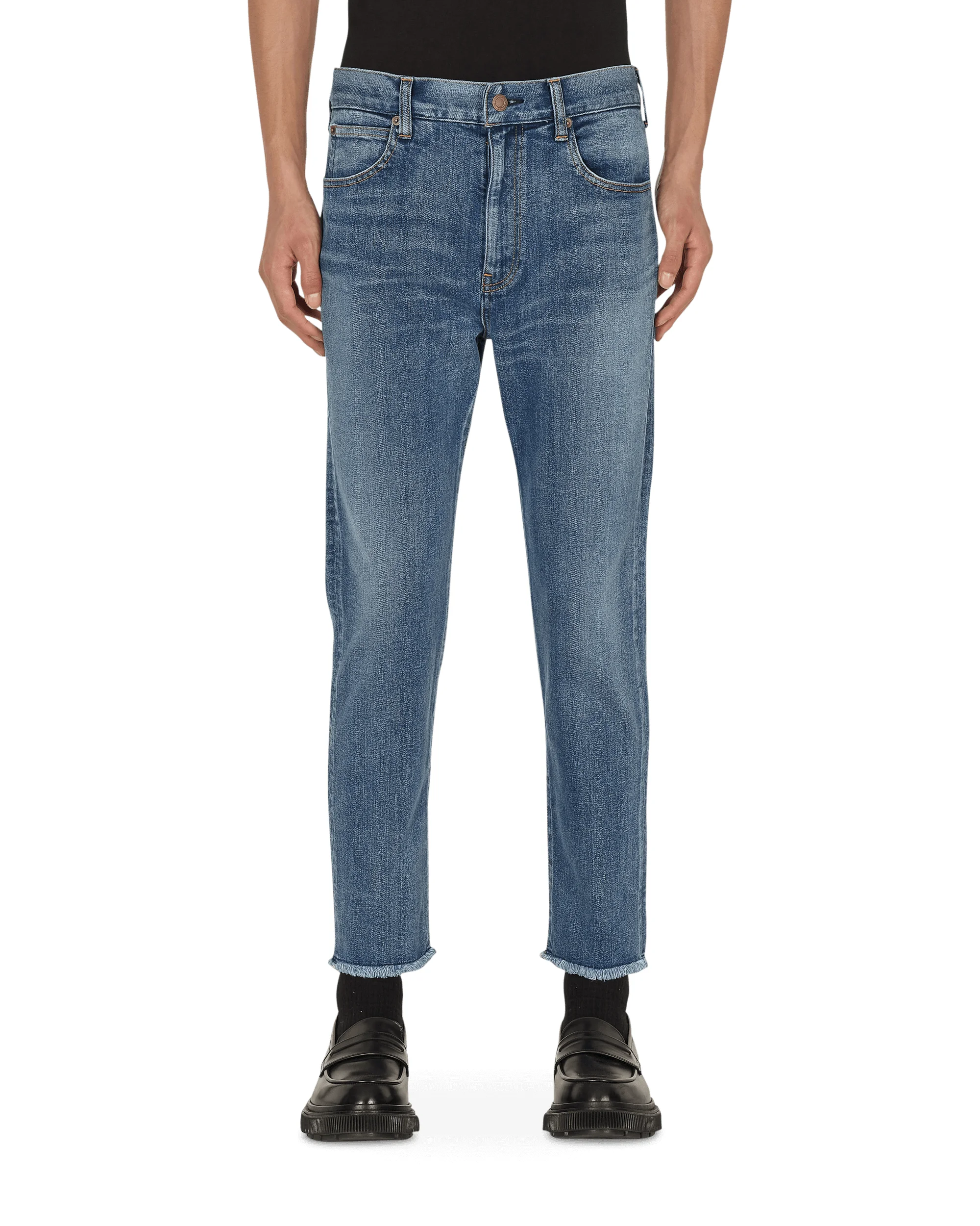 Undercover Slim Denim Pants Indigo - 95% Cotton, 5% Polyurethane - Flap Button Closure - Zip-Fly - Belt Loops - 5-Pocket Design - Back Zip Details - Raw Hem - Made in Japan - Style Code: UC1A4509-2 INDIGO SIZE & FIT Model is 6ft 1in/1.86m with a 26"/67cm waist and wears size L. Measures (Size L): 38cm Waist, 28cm Rise, 92cm Outseam, 65cm Inseam, 14cm Ankle.