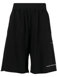 slogan-print cotton track shorts Highlights - Black - Cotton - Slogan print to the side - Logo patch to the rear - Elasticated waistband - Knee-length - Rear welt pocket Imported Composition Body: Cotton 100% SIZE & FIT Model measurements Height 6 ft 2 in(1.87 m) Bust/Chest 34.25 in(87 cm) Hips 36.22 in(92 cm) Waist 29.52 in(75 cm) FittingInformation Designed for a straight-leg fit, offering an unrestricted and comfortable fit over the leg Adjust this piece’s waistband to your preference using the drawstring Made from a midweight non-stretch fabric, this piece offers minimal elasticity when worn This piece fits true to size – take your usual size Washing instructions Hand Wash