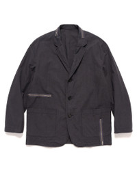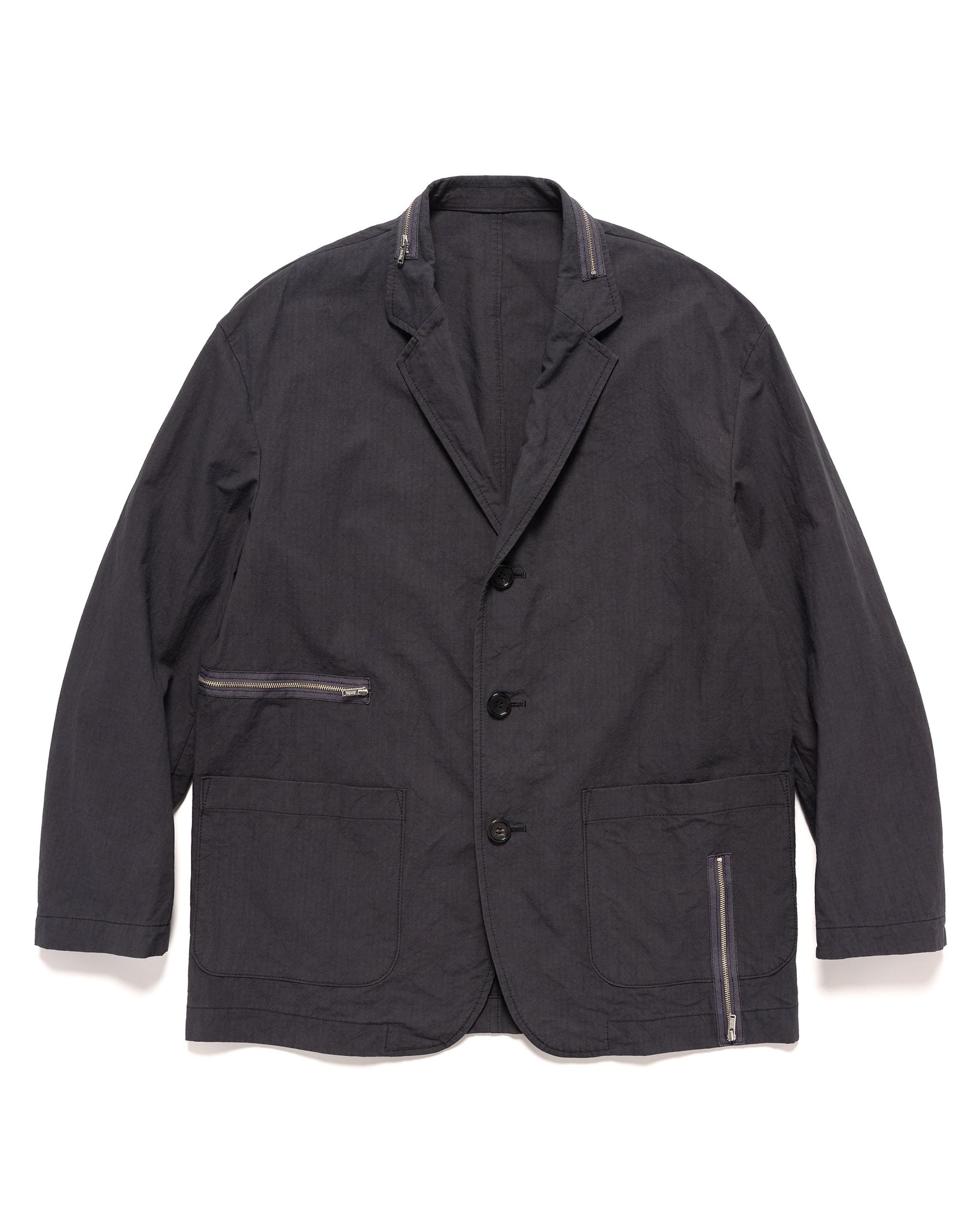 A unique unstructured blazer jacket featuring a three button front opening, constructed from 100% cotton ripstop. The front has two patch hand pockets and features unique zipper details throughout. Made in Japan. DETAILS - UC1C4102-2 - 100% cotton ripstop - Button front opening - Patch hand pockets - Zippers at neck, waist, front - Zip sleeve adjustment - Woven brand patch - Made in Japan