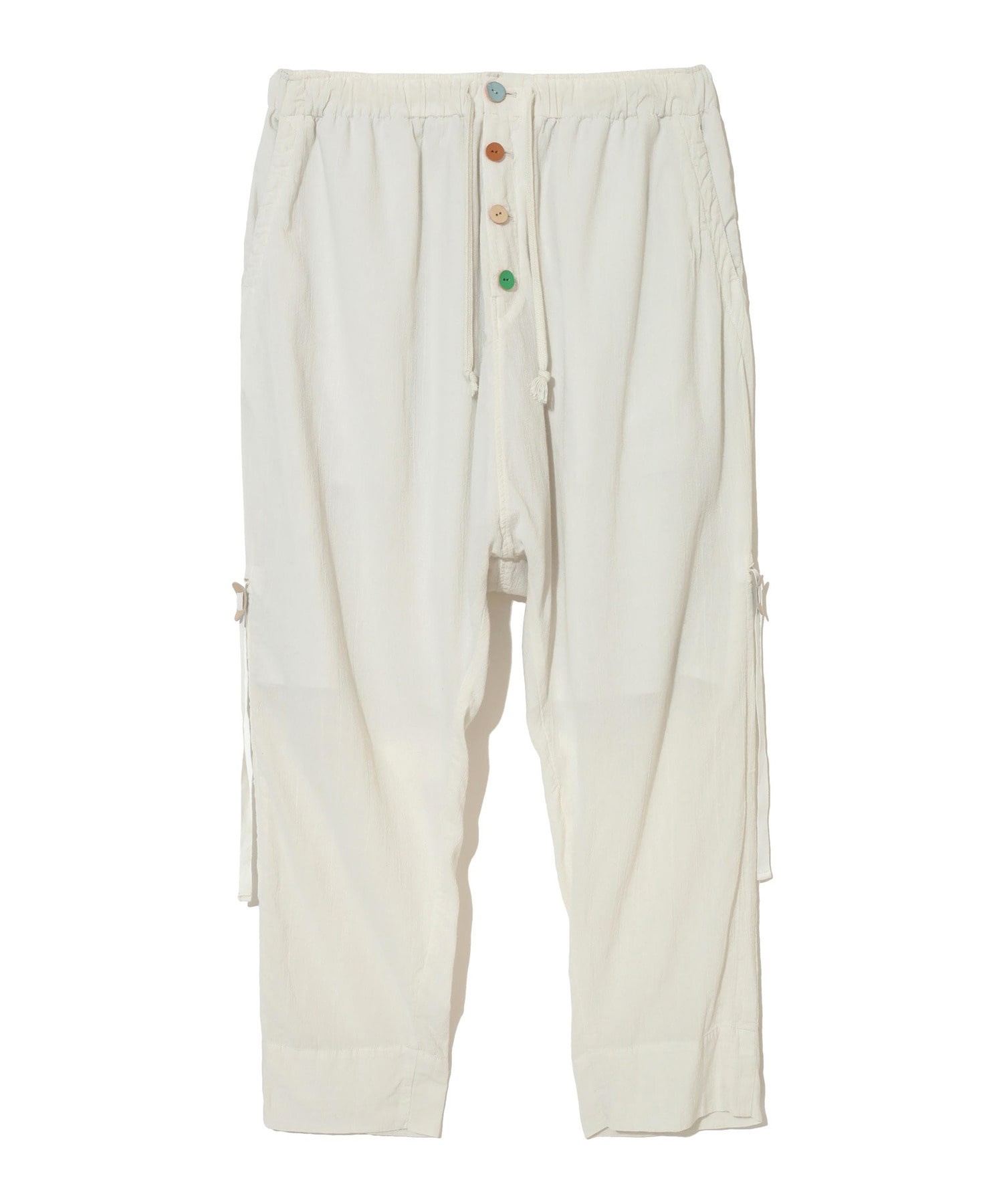 -Cotton/rayon sarouel pants -Elastic waist -Leather buttons -Strings with adjustable gathers on the sides -Back flap pocket and welt pocket MATERIAL 50% RATYON, 50% COTTON PARTLY: 100% WOOL