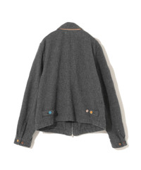 - Blouson with frizzy finish - Switching of leather collar lining - Adjustable collar with wires placed in the collar - Buttons in random color scheme MATERIAL 90% WOOL 10% NYLON PARTLY: COWHIDE