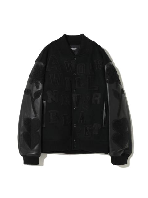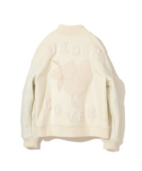 -Stadium jumber dropped in KAMILLA TOLNø's work -Sagarara emblem for the front and rear and arm -The body is nylon blend wool -The piping of the arm and the pocket is Cow Seather -Quilting liner ©2023 Kamilla Tolnø MATERIAL SURFACE1: 96% WOOL, 4% NYLON SURFACE2: COWHIDE FILLING: 100% POLYESTER LINING: 100% CUPRO RIB: 70% ACRYLIC, 30% WOOL