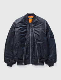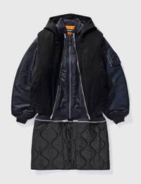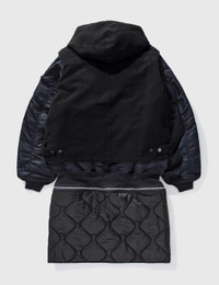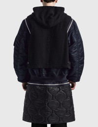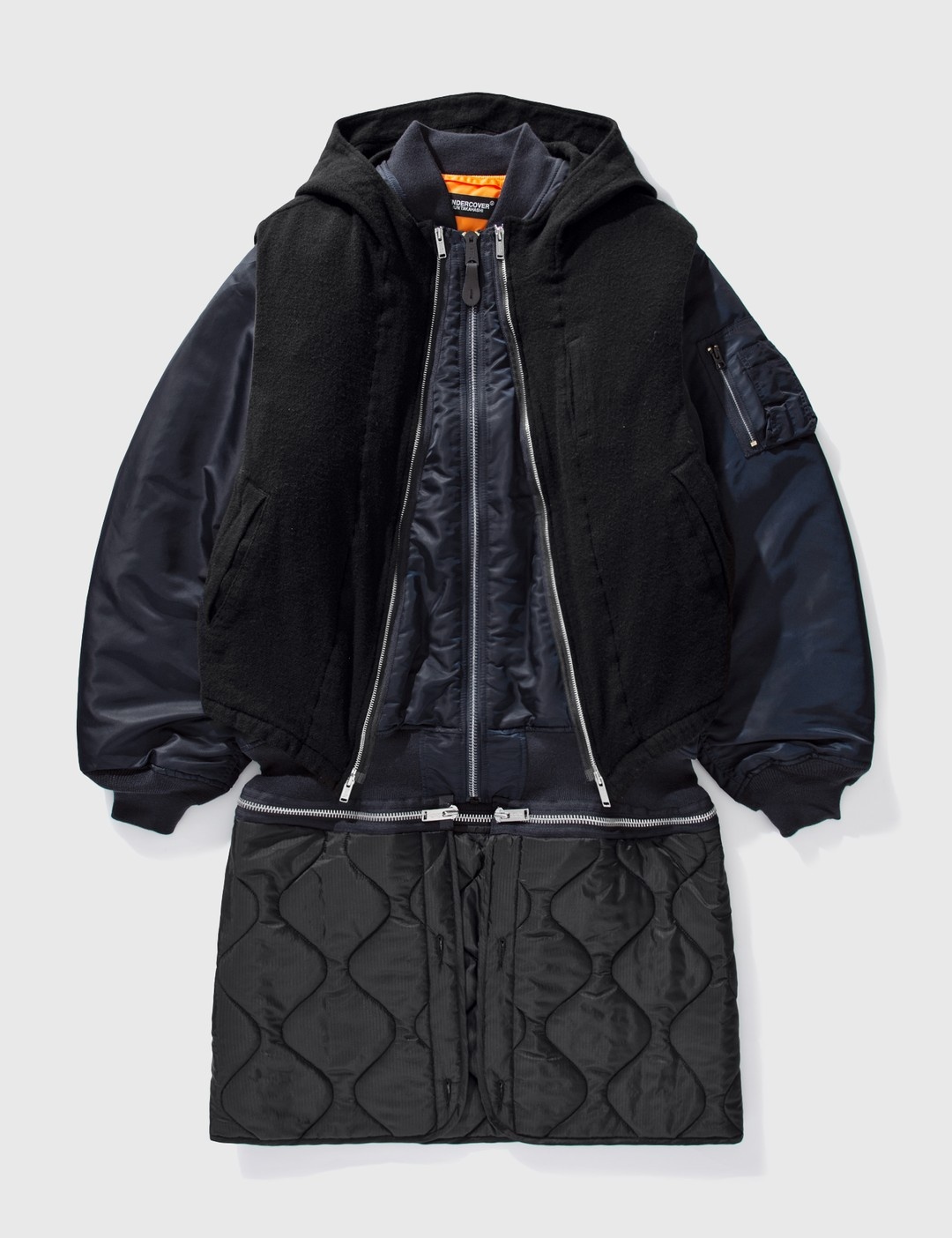 - Undercover - Undercover x Alpha Industries Coat - Ribbed collar, cuffs and hem - Front zip fastening - Side pockets - Utility pocket at left sleeve - Detachable, zip fastened hooded vest - Detachable, quilted hem panel - Color: Navy - Material: 100% Nylon, 100% Wool - See more Coats, Jackets and Clothing SIZING - Model wears size 4 - Model measures: Height 183cm, Chest 36”/91cm, Waist 28”/70cm, Hip 36”/91cm