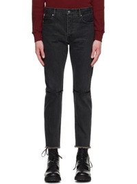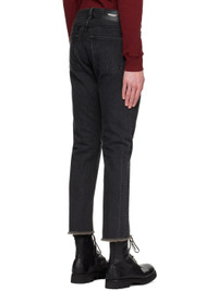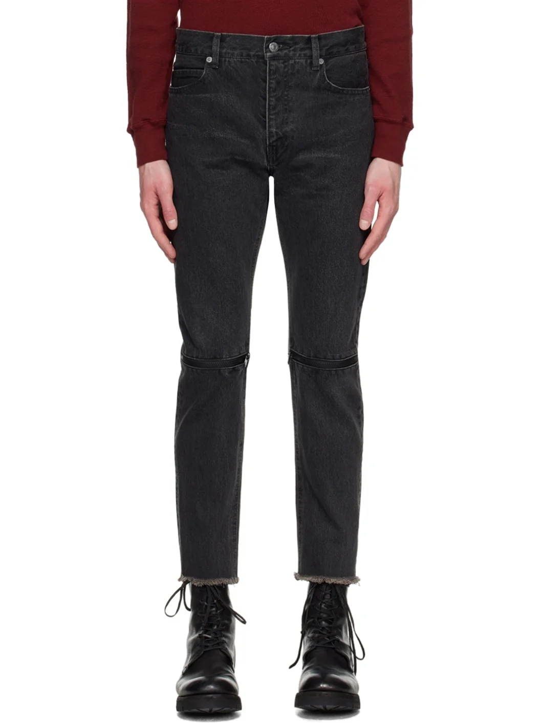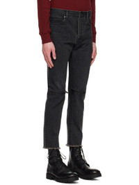 non-stretch denim jeans. Fading and whiskering throughout. · Belt loops · Five-pocket styling · Zip-fly · Zip vents at knees · Raw edges at cuffs · Logo patch at back waist · Logo flag at back pocket · Logo-engraved gunmetal-tone and black hardware Supplier color: Black 100% cotton. Made in Japan 231414M186000