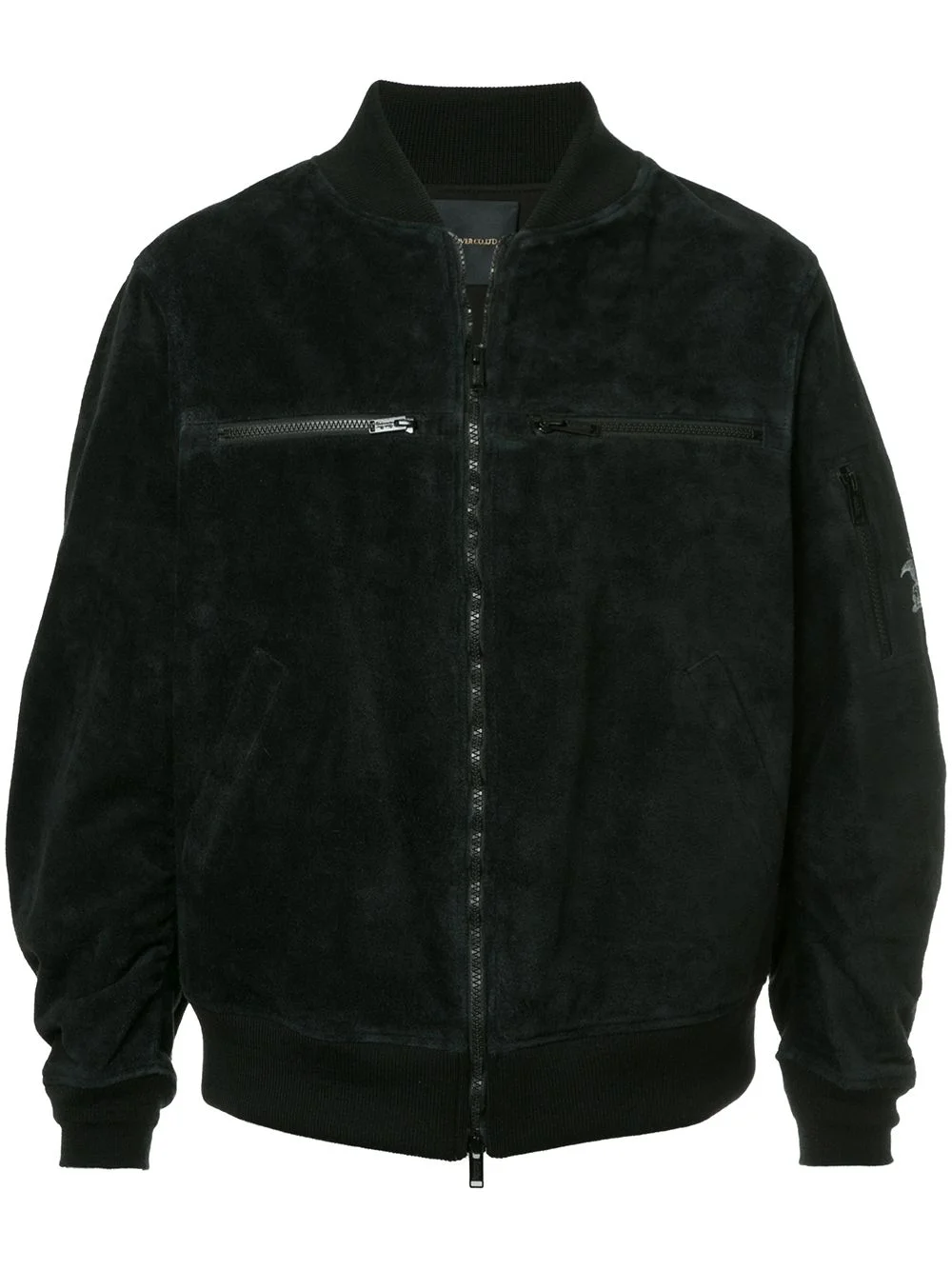 zip pocket bomber jacket Black cowhide leather zip pocket bomber jacket from Undercover. Imported Composition Outer: Bos Taurus 100%, Wool 50%, Polyester 50% Lining: Cotton 55%, Cupro 45% SIZE & FIT Model measurements Height 6 ft 3 in(1.9 m) Bust/Chest 37.4 in(95 cm) Hips 35.43 in(90 cm) Waist 29.92 in(76 cm) Washing instructions Dry Clean Only
