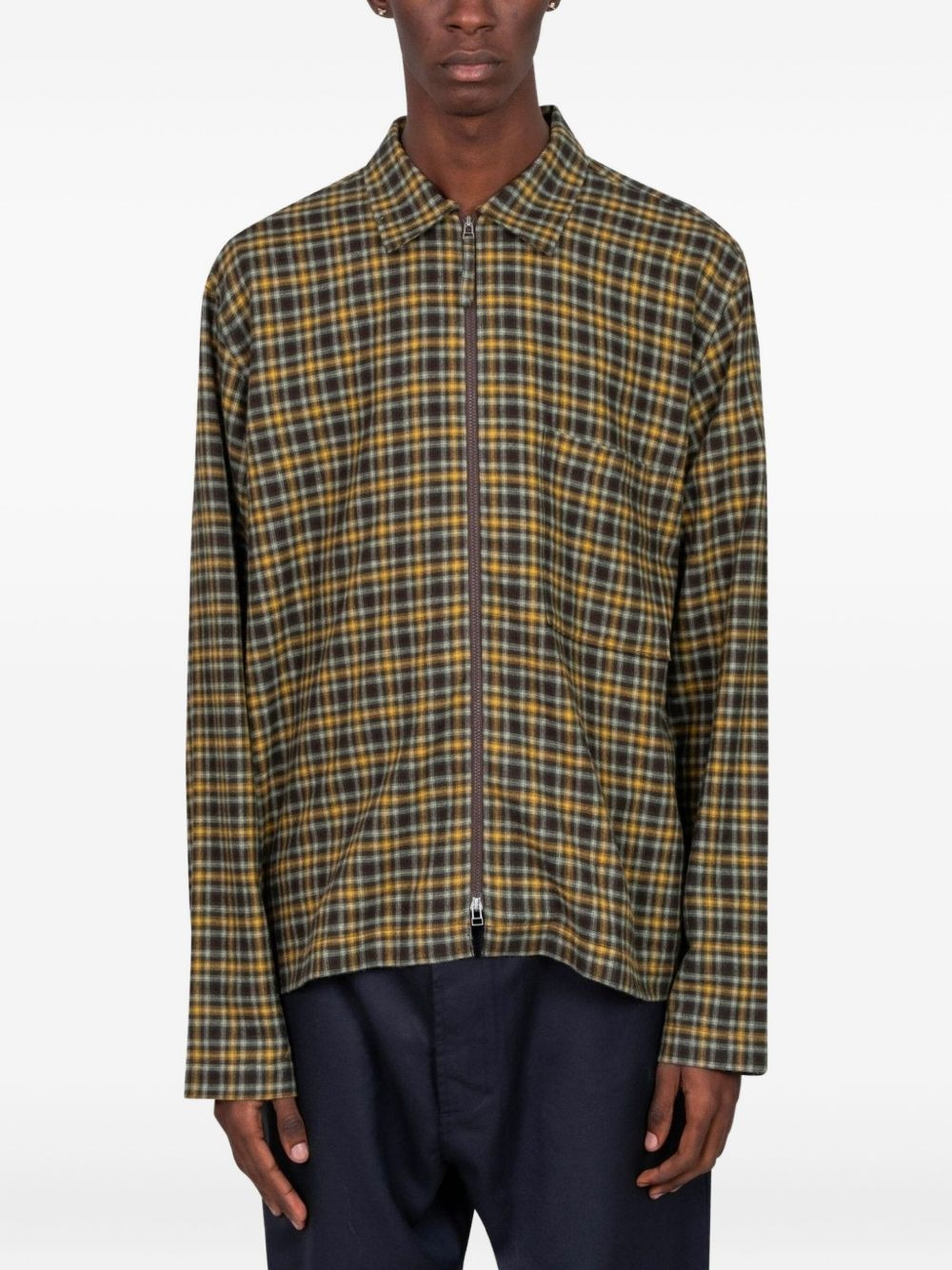 checked shirt Highlights - Brown - Check pattern - Front zip fastening - Long sleeves Imported Composition Cotton 80%, Wool 20% Washing instructions Read Manufacturer Guidelines