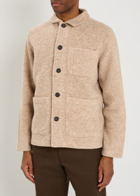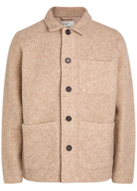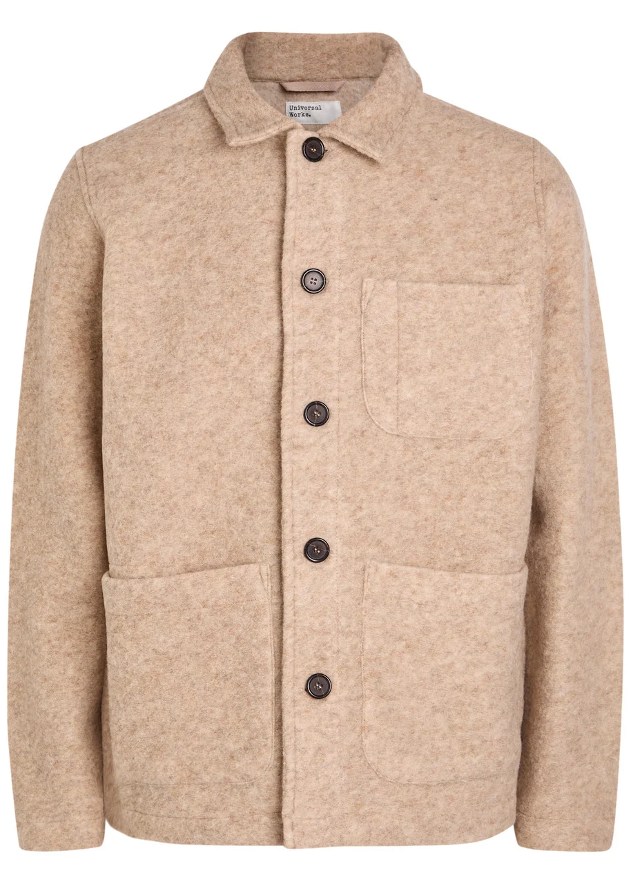 Info & Care Universal Works wool-blend jacket Three patch pockets Button fastenings through front 65% wool, 35% recycled polyester Machine wash Size & Fit Length shoulder to hem: 28 inches/ 71cm Midweight Regular fit Model is 6'2"/ 188cm, chest size 38 inches and wears a size medium