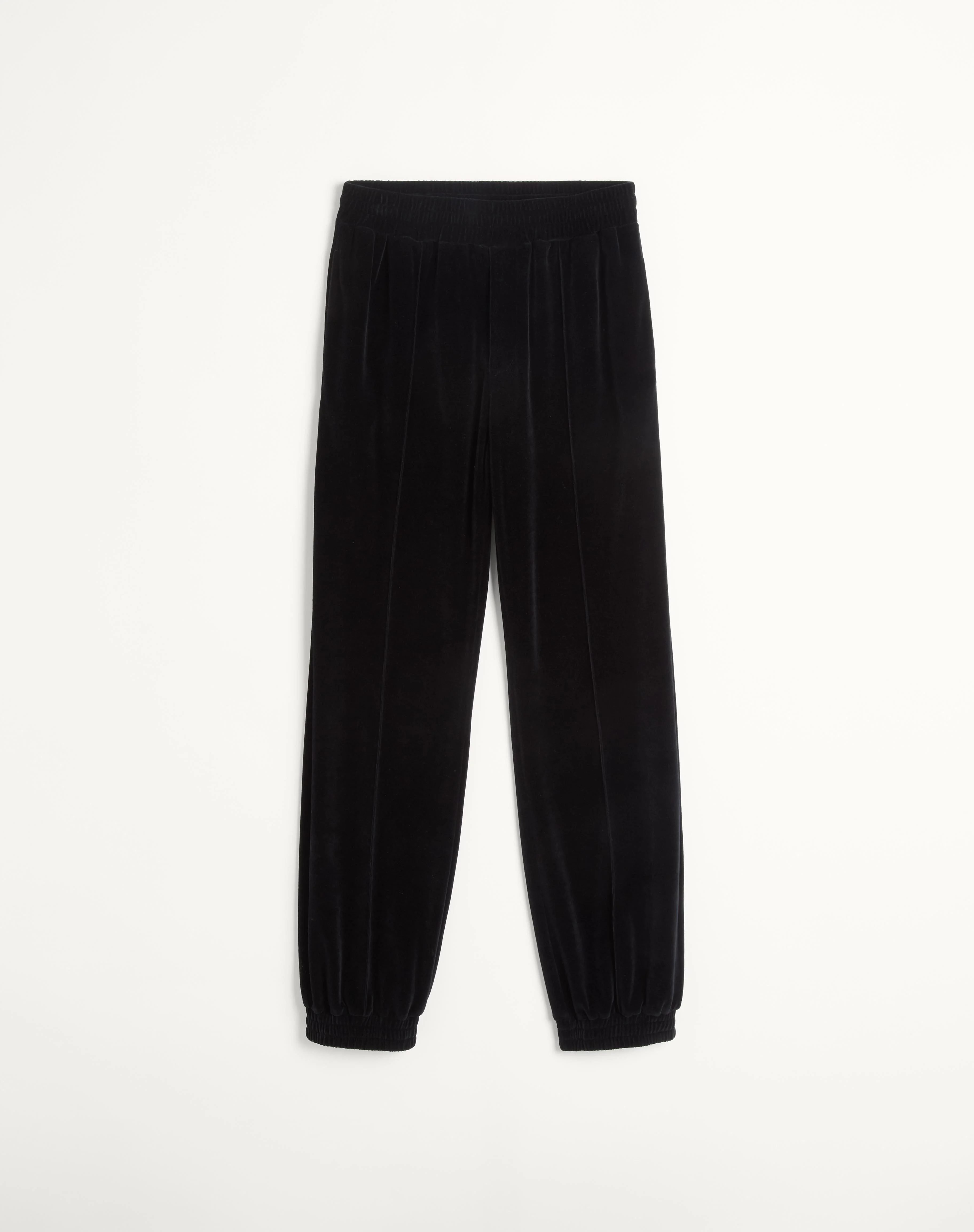 Valentino chenille joggers with Chez Valentino patch - Regular fit - Embroidered Chez Valentino patch on the back pocket - Drawstring waist - Two side pockets - Elasticated ankles - Composition: 85% Cotton, 15% Polyamide - Length: 107 cm / 42.1 in. in a size M - Leg openings: 16.5 cm / 6.5 in. in a size M - The model is 187 cm / 6'1" tall and wears a size M - Made in Italy The look of the model is completed by a Valentino Garavani 9TO5 Bag and Valentino Garavani Pat Shoes. Product code: 6V3MD05AARD_0NO
