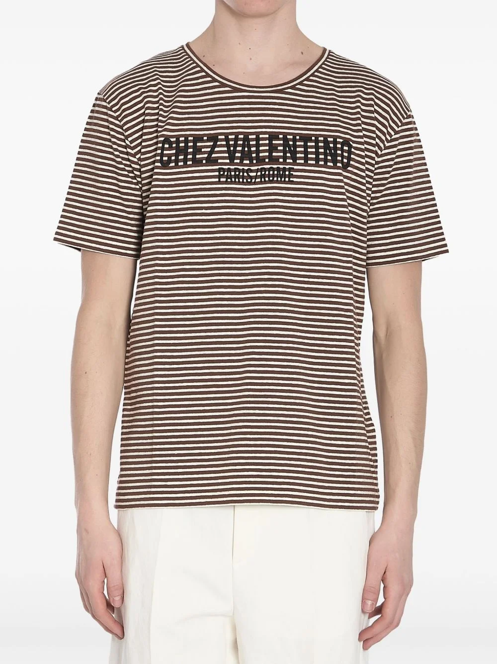 Chez t-shirt Highlights - Brown - Pinstripe pattern - Crew neck - Short sleeves Made in Italy Composition Linen/Flax 63%, Cotton 34%, Elastane 3%
