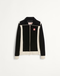 Chenille high-neck sweatshirt with zipper and Chez Valentino patch - Regular fit - Chez Valentino patch embroidered on the left breast as worn - Zipper closure - Elasticated ribbed trim - Contrasting wool details - Composition: 85% Cotton, 15% Polyamide - Length: 66 cm / 26 in. from the back of the neck in a size M - The model is 187 cm / 6'1" tall and wears a size M - Made in Italy The look of the model is completed by a Valentino Garavani 9TO5 Bag and Valentino Garavani Pat Shoes. Product code: 6V3MF28VARA_0NO