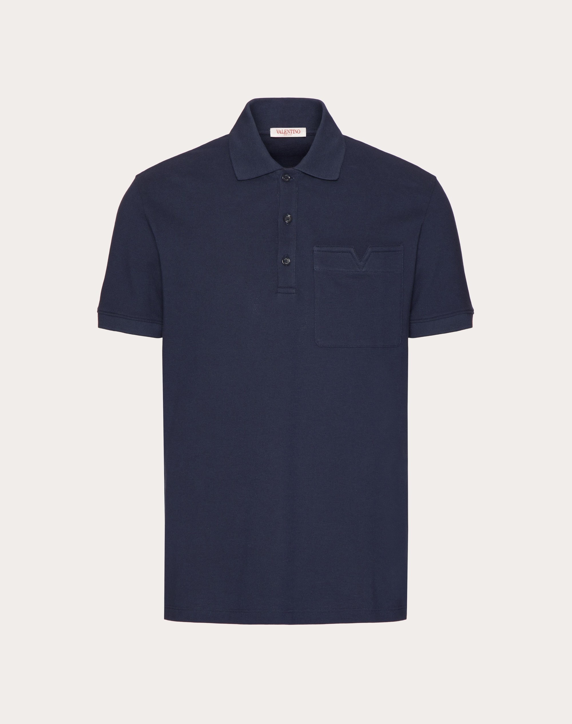 Valentino cotton pique polo shirt with topstitched V Detail - Regular fit - V Detail stitched on left breast pocket as worn - Ribbed collar and cuffs - Composition: 100% Cotton - Length: 71 cm / 28 in. from the back of the neck in a size M - The model is 187 cm / 6'1" tall and wears a size M - Made in Italy The look of the model is completed by Valentino Garavani Freedots Shoes. Product code: 4V3MH03C9WP_598