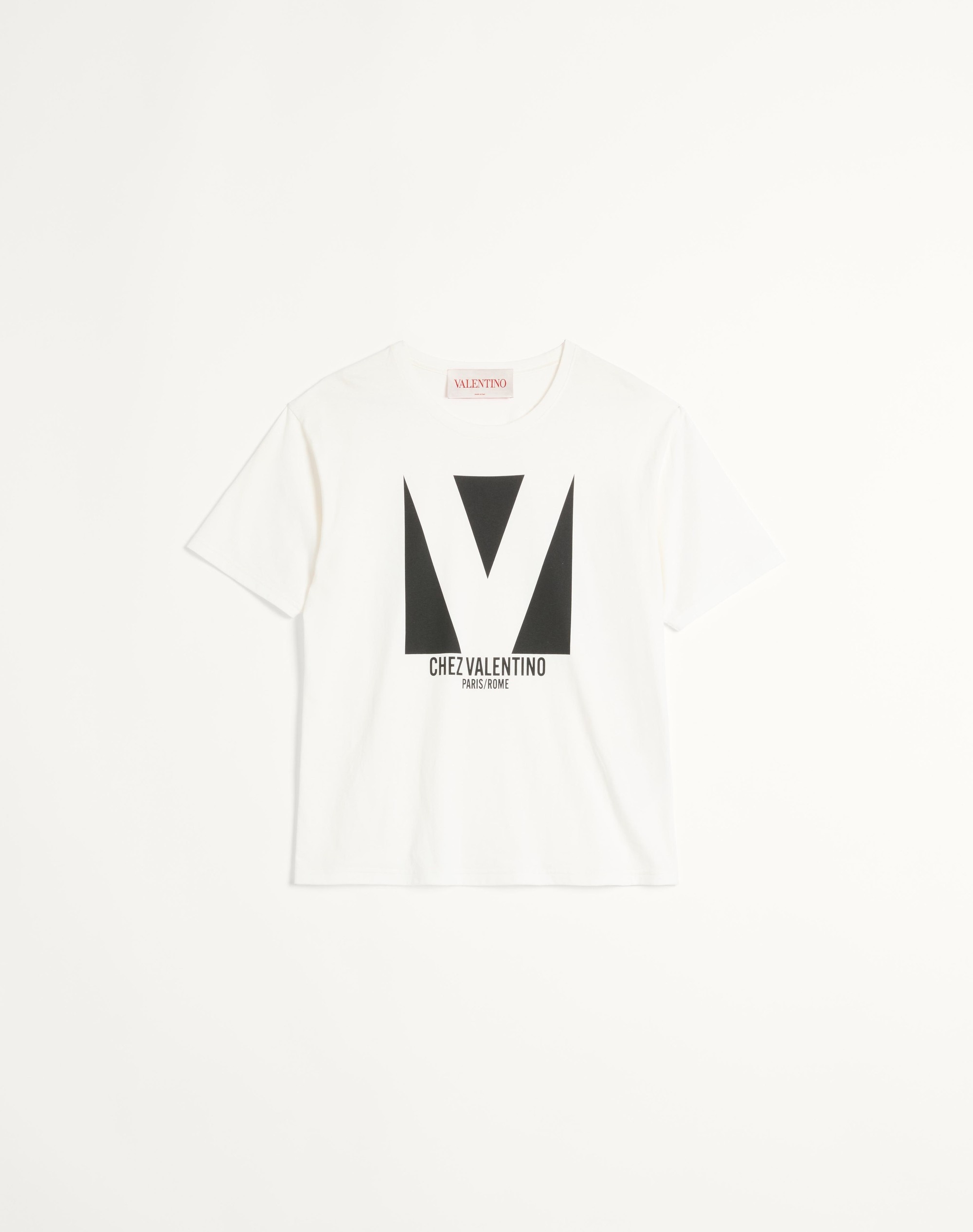 Valentino cotton T-shirt with Chez Valentino print - Regular fit - Chez Valentino print on chest - Composition: 100% Cotton - Length: 70 cm / 27.5 in. from the back of the neck in a size M - The model is 187 cm / 6'1" tall and wears a size L - Made in Italy The look of the model is completed by a Valentino Garavani Nellcote Bag and Valentino Garavani Bay By Bay Shoes. Product code: 6V3MG16PAQ9_A03