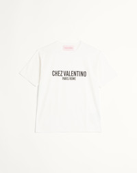 Valentino cotton T-shirt with Chez Valentino print - Regular fit - Chez Valentino print on chest - Composition: 100% Cotton - Length: 70 cm / 27.5 in. from the back of the neck in a size M - The model is 187 cm / 6'1" tall and wears a size L - Made in Italy The look of the model is completed by Valentino Garavani Pat Shoes. Product code: 6V3MG16PAPG_A03