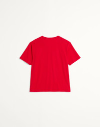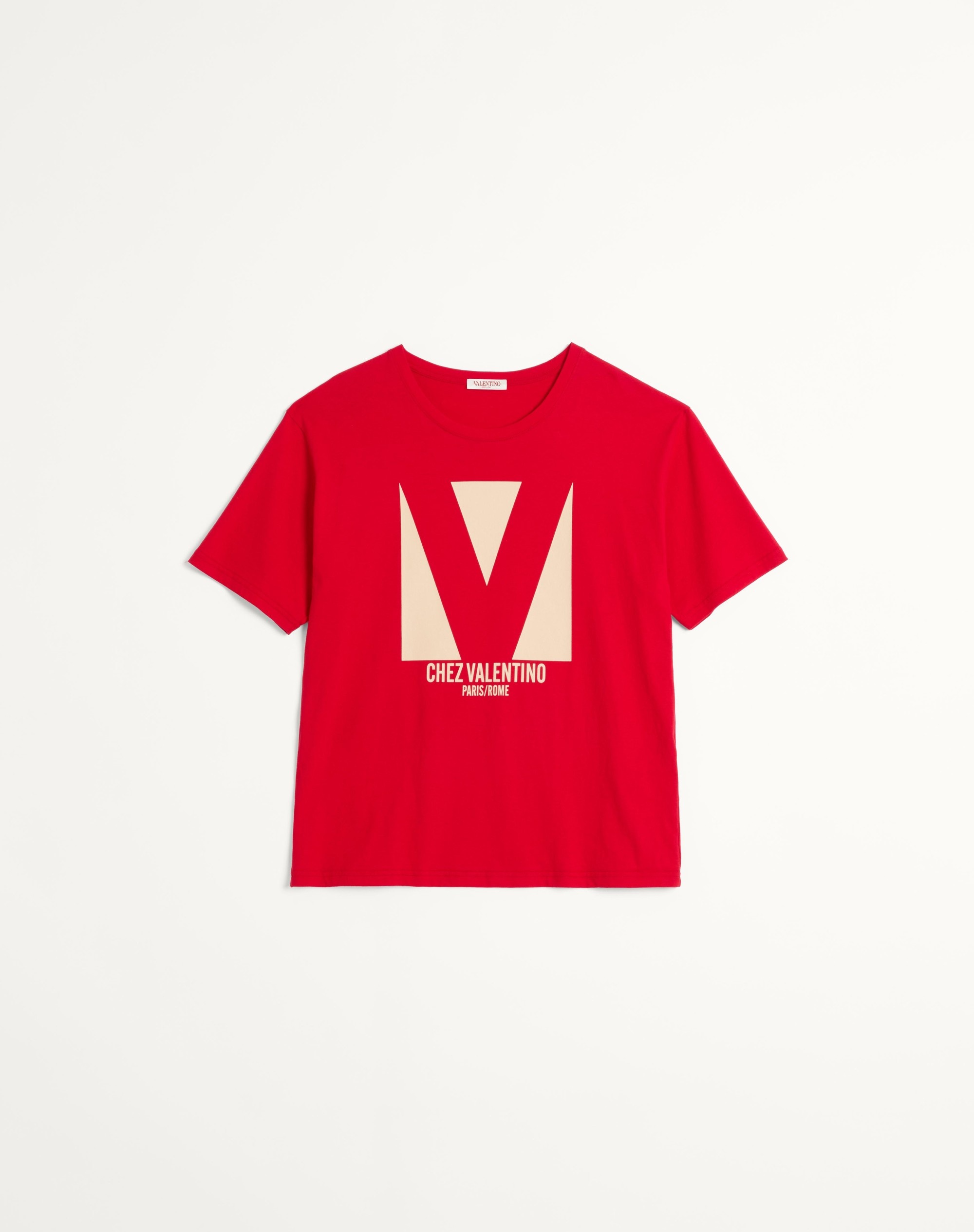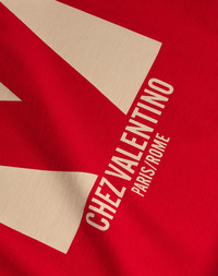 Valentino cotton T-shirt with Chez Valentino print - Regular fit - Chez Valentino print on chest - Composition: 100% Cotton - Length: 70 cm / 27.5 in. from the back of the neck in a size M - The model is 187 cm / 6'1" tall and wears a size L - Made in Italy The look of the model is completed by a Valentino Garavani Nellcote Bag and Valentino Garavani Bay By Bay Shoes. Product code: 6V3MG16PAQ9_157