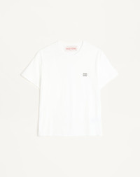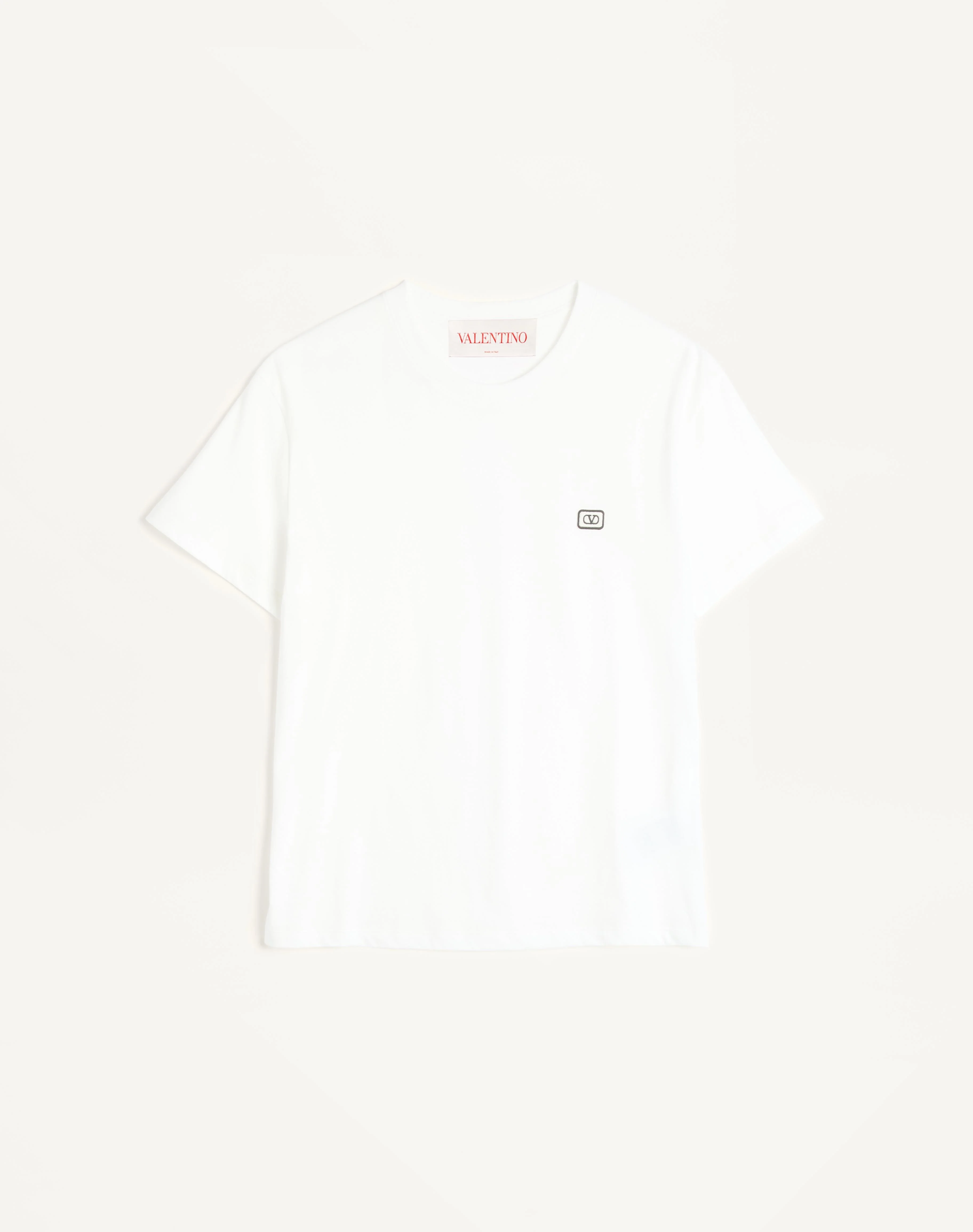 Valentino cotton T-shirt with VLogo patch - Regular fit - VLogo Signature patch on left breast as worn - Composition: 100% Cotton - Length: 70 cm / 27.6 in. from the back of the neck in a size M - The model is 187 cm / 6'1" tall and wears a size M - Made in Italy The look of the model is completed by a Valentino Garavani Nellcote Bag and Valentino Garavani Pat Shoes. Product code: 6V3MG10VAQ8_A03
