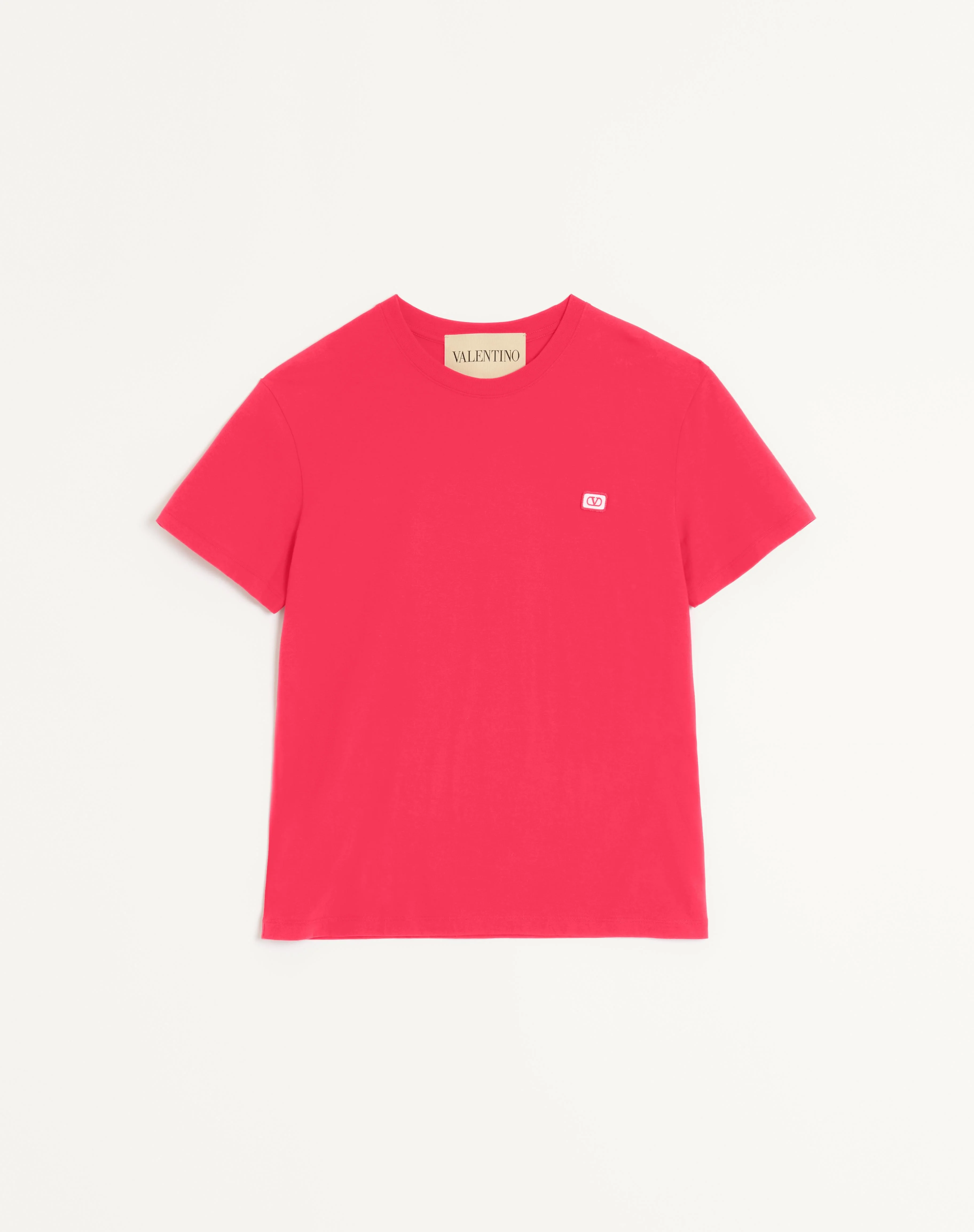Valentino cotton T-shirt with VLogo patch - Regular fit - VLogo Signature patch on left breast as worn - Composition: 100% Cotton - Length: 70 cm / 27.6 in. from the back of the neck in a size M - The model is 187 cm / 6'1" tall and wears a size M - Made in Italy The look of the model is completed by a Valentino Garavani Nellcote Bag and Valentino Garavani Pat Shoes. Product code: 7V3MG10VAQ8_157