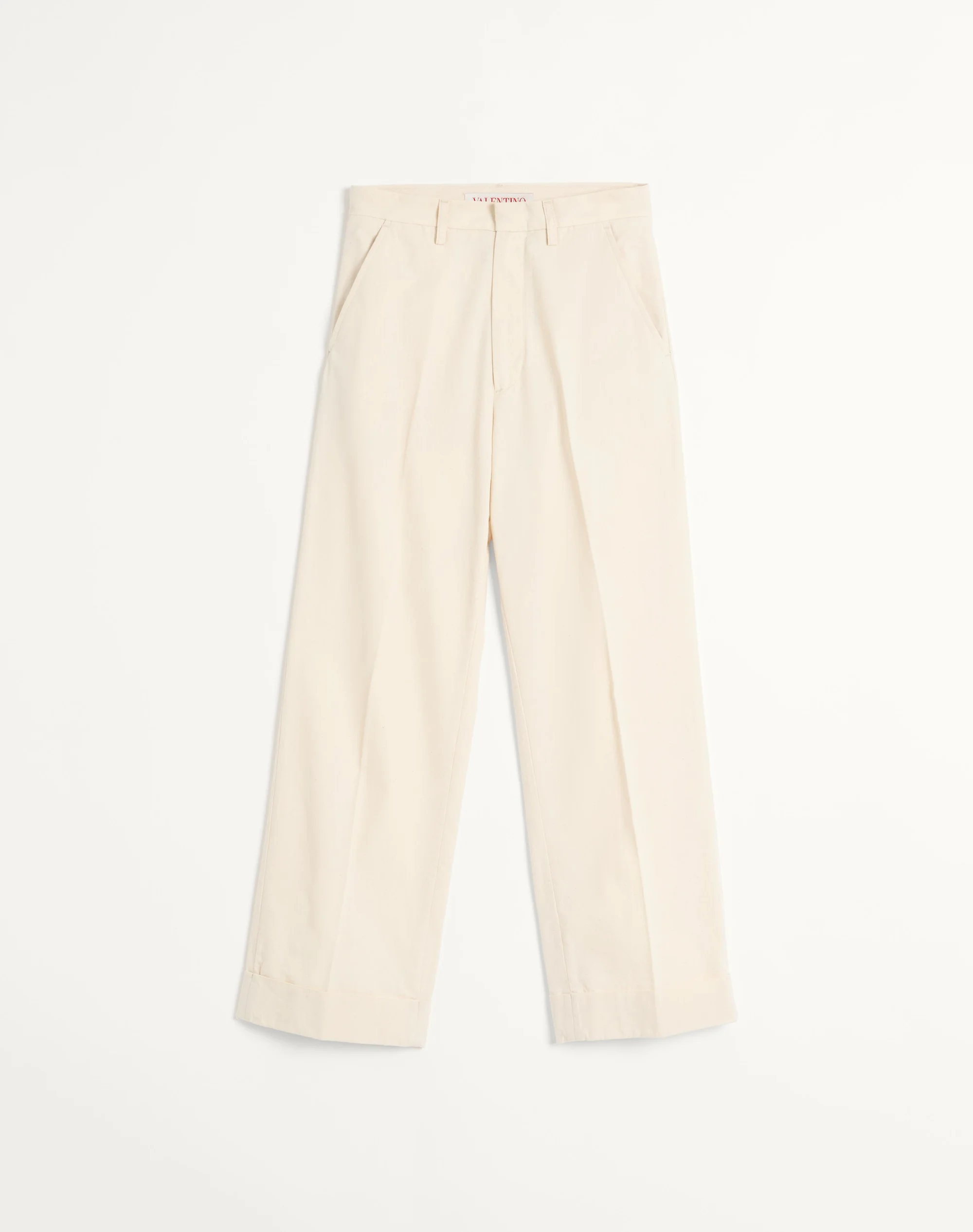 Valentino cuffed denim pants - Wide cropped fit - Two side pockets - Two back pockets - Composition: 100% Cotton - Length: 103 cm / 40.5 in. in an Italian size 46 - Leg opening: 26.5 cm / 10.4 in. in an Italian size 46 - The model is 187 cm / 6'1" tall and wears an Italian size 46 - Made in Italy The look of the model is completed by a Valentino Garavani Nellcote Bag and Valentino Garavani Viva Superstar Shoes. Product code: 6V3DD03QAP1_05X