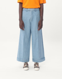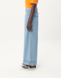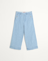 Valentino cuffed denim pants - Wide cropped fit - Two side pockets with buttons - Composition: 100% Cotton - Length: 98 cm / 38.6 in. in an Italian size 46 - Leg opening: 32.5 cm / 12.8 in. in an Italian size 46 - The model is 187 cm / 6'1" tall and wears an Italian size 46 - Made in Italy The look of the model is completed by a Valentino Garavani Nellcote Bag and Valentino Garavani Bay By Bay Shoes. Product code: 6V3DD03UALM_508
