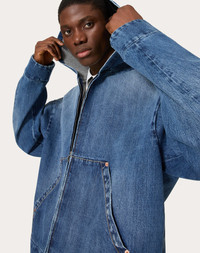 Valentino denim jacket with hood - Garment made using the heat-sealing technique: the outer denim fabric has been bonded and adhered with an inner layer of neoprene - Oversized fit - One stud applied to the back bezel -Zipper closure - Two side pockets - Composition: 100% Cotton - Length: 70 cm / 27.6 in. from the back of the neck in a size M - The model is 187 cm / 6'1" tall and wears a size M - Made in Italy The look of the model is completed by Valentino Garavani Valentino Garavani Gentleglam Shoes. Product code: 5V0DC03XAEL_558