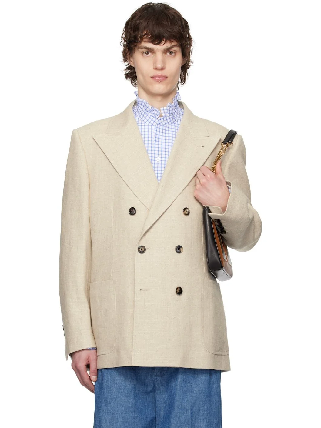Plain-woven linen-blend blazer. · Peaked lapel · Double-breasted button closure · Welt and patch pockets · Padded shoulders · Four-button surgeon's cuffs · Central vent at back hem · Welt pockets at interior · Full broadcloth lining Supplier color: Naturale