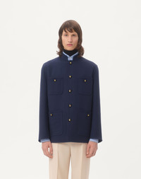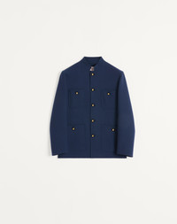 Valentino double wool jacket with mandarin collar - Regular fit - Two front patch pockets with buttons - Two breast patch pockets with buttons - Composition: 99% Virgin Wool, 1% Silk - Length: 74 cm / 29.1 in. from the back of the neck in an Italian size 46 - The model is 187 cm / 6'1" tall and wears an Italian size 46 - Made in Italy The look of the model is completed by a Valentino Garavani Nellcote Bag and Valentino Garavani Bay By Bay Shoes. Product code: 6V3CJH377PP_D51