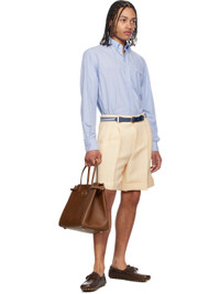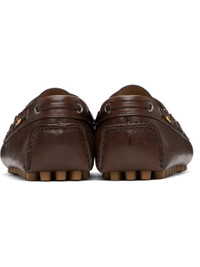 Grained buffalo leather loafers in brown. · Square moc toe · Lace-up closure · Lace-up detailing at collar · Logo hardware at outer side · Pinched seam at heel counter · Grained leather lining · Treaded rubber sole · Antiqued brass-tone hardware Supplier color: Bark brown Upper: buffalo leather. Sole: rubber. Made in Italy 251807M231012