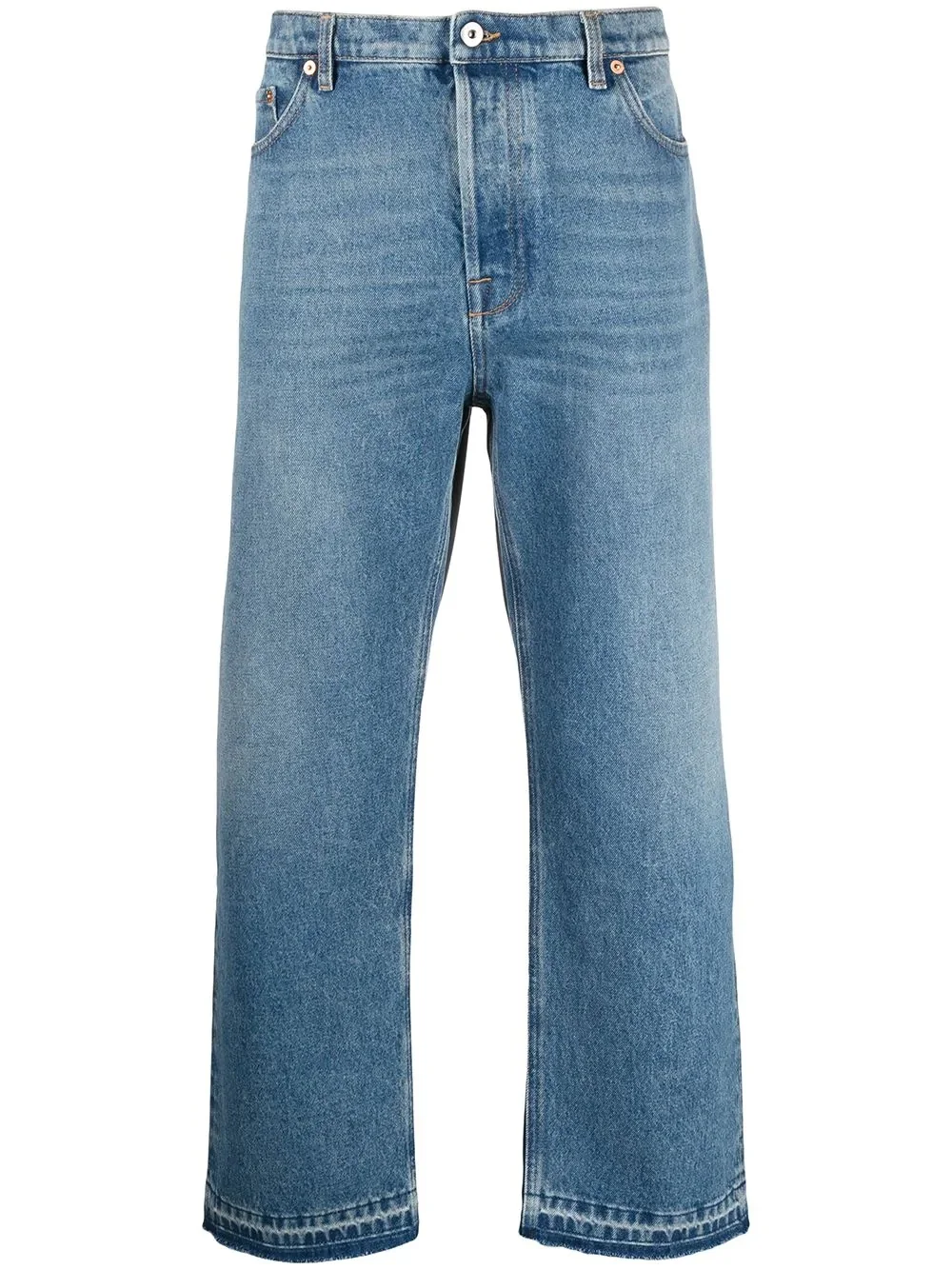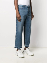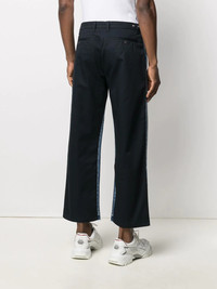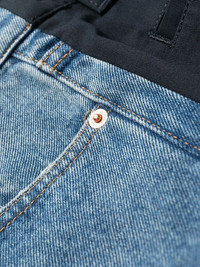 dual material denim trousers Casual on the front, formal on the back. Constructed with a dual material with denim front and cotton gabardine back, these Valentino Garavani trousers are perfect for those days where change can happen in an instant. Now you're ready. Highlights - Valentino ready to wear - Dark blue/light blue - Cotton - Contrasting panel detail - Mid-rise - Belt loops - Front button fastening - Classic five pockets - Two rear button-fastening pockets - Straight leg Made in Italy Composition Outer: Cotton 100% Lining: Cotton 100% SIZE & FIT Model measurements Height 6 ft 2 in(1.89 m) Bust/Chest 36.22 in(92 cm) Hips 35.82 in(91 cm) Waist 28.74 in(73 cm) Washing instructions Read Manufacturer Guidelines