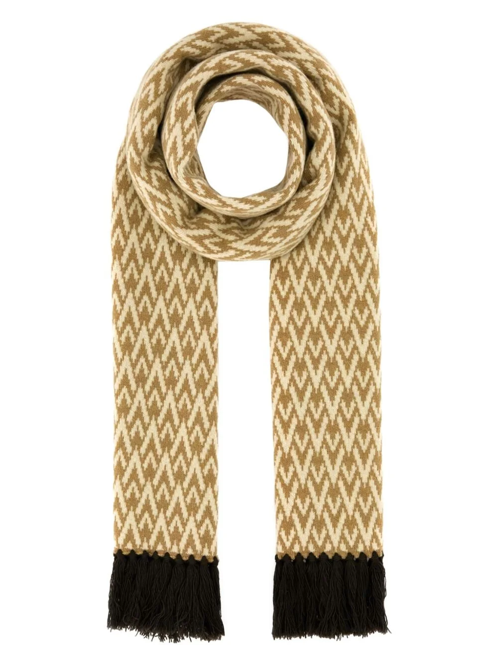 geometric-patterned scarf Highlights - Beige - Fringed detailing - Contrast tassel edges - Triangular motif - Soft finish - Lightweight design Made in Italy Composition Virgin Wool 100% SIZE & FIT Measurement LENGTH 77.95 in(198 cm) WIDTH 9.44 in(24 cm)