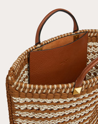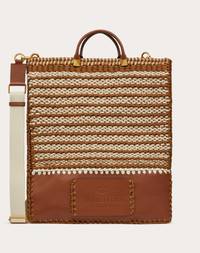 Valentino Garavani Crochet Bags flat tote in woven fabric and maxi studs. - Hot-stamped Valentino Garavani logo detail - Dark antique brass-finish hardware and maxi stud detailing - Leather details - Open internal pocket - Adjustable and removable shoulder strap - Drop Length: 55 cm / 21.7 in. - Valentino Garavani logo - Dimensions: W36 x H43 x D3 cm / W14.2 x H17 x D1.2 in. - Made in Italy Product Code YB0B39BHA_GA1