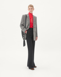 Valentino nylon gabardine pants - Flare fit - Two side pockets - Two back pockets - Pressed pleats - Composition: 55% Polyester, 45% Wool - Length: 101 cm / 39.8 in. in an Italian size 46 - Leg opening: 34 cm / 13.4 in. in an Italian size 46 - The model is 187 cm / 6'1" tall and wears an Italian size 46 - Made in Italy The look of the model is completed by a Valentino Garavani Nellcote Bag and Valentino Garavani Babouchoues Shoes. Product code: 8V3RBN70AWA_0NO