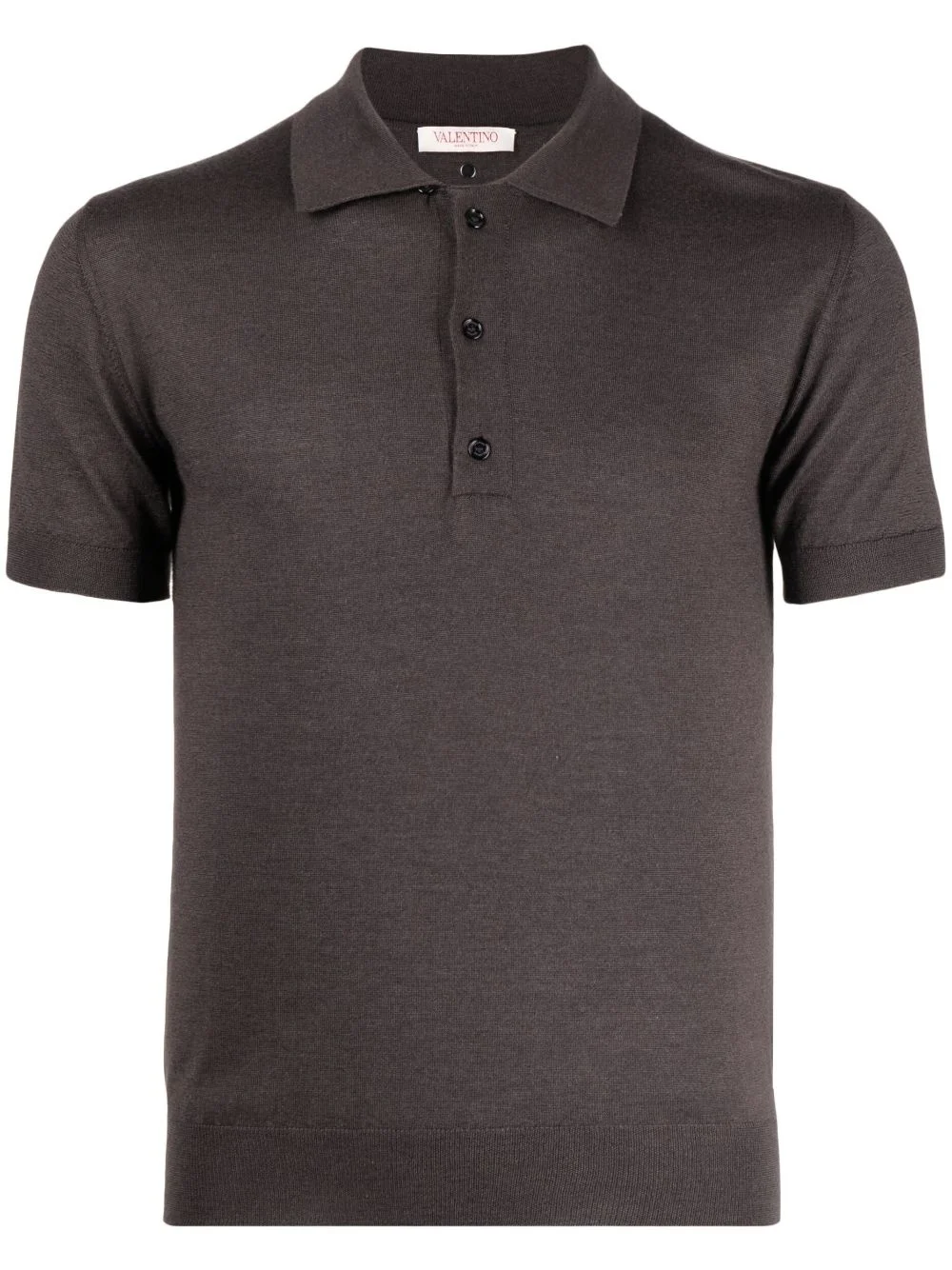 knitted short-sleeve polo shirt Valentino Garavani's refined aesthetic is evident in the elevated fine-knit construction of this polo shirt. It is crafted from organic silk and cashmere for a soft feel. Highlights - Valentino ready to wear - Chocolate brown - Cashmere-organic silk blend - Fine knit - Polo collar - Front button placket - Short sleeves - Ribbed cuffs and hem Made in Italy Composition Cashmere 70%, Organic Silk 30% SIZE & FIT Model measurements Height 6 ft 3 in(1.9 m) Bust/Chest 35.03 in(89 cm) Hips 36.61 in(93 cm) Waist 29.13 in(74 cm) Measurement CHEST 37 in(94 cm) Shoulder Width 16.14 in(41 cm) FittingInformation Designed for a slim fit, this polo shirt offers a comfortable fit that sits just away from the body Made with a fine knit, this piece offers some stretch This piece fits true to size – take your usual size