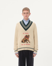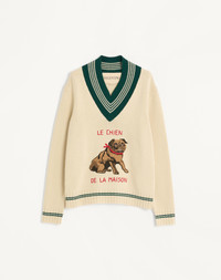 Valentino wool jumper with Le Chien de la Maison jacquard embroidery - Regular fit - Gauge: 5 - Le Chien de la Maison jacquard embroidery on the chest - Composition: 100% Wool - Length: 64 cm / 25.2 in. from the back of the neck in a size M - The model is 187 cm / 6'1" tall and wears a size M - Made in Italy The look of the model is completed by Valentino Garavani Alcovettes Shoes. Product code: 7V3KC35EB2M_581