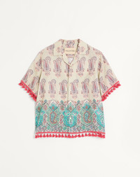 Valentino lightweight linen bowling shirt with all-over Voyage Imaginaire print - Boxy fit - All-over Voyage Imaginaire print - Tasseled edges - Composition: 100% Linen - Length: 73.5 cm / 28.9 in. from the back of the neck in an Italian size 46 - The model is 187 cm / 6'1" tall and wears an Italian size 46 - Made in Italy The look of the model is completed by a Valentino Garavani Nellcote Bag and Valentino Garavani VLogo Signature Shoes. Product code: 7V3AA111B07_DRG