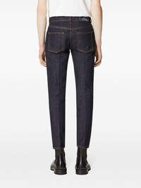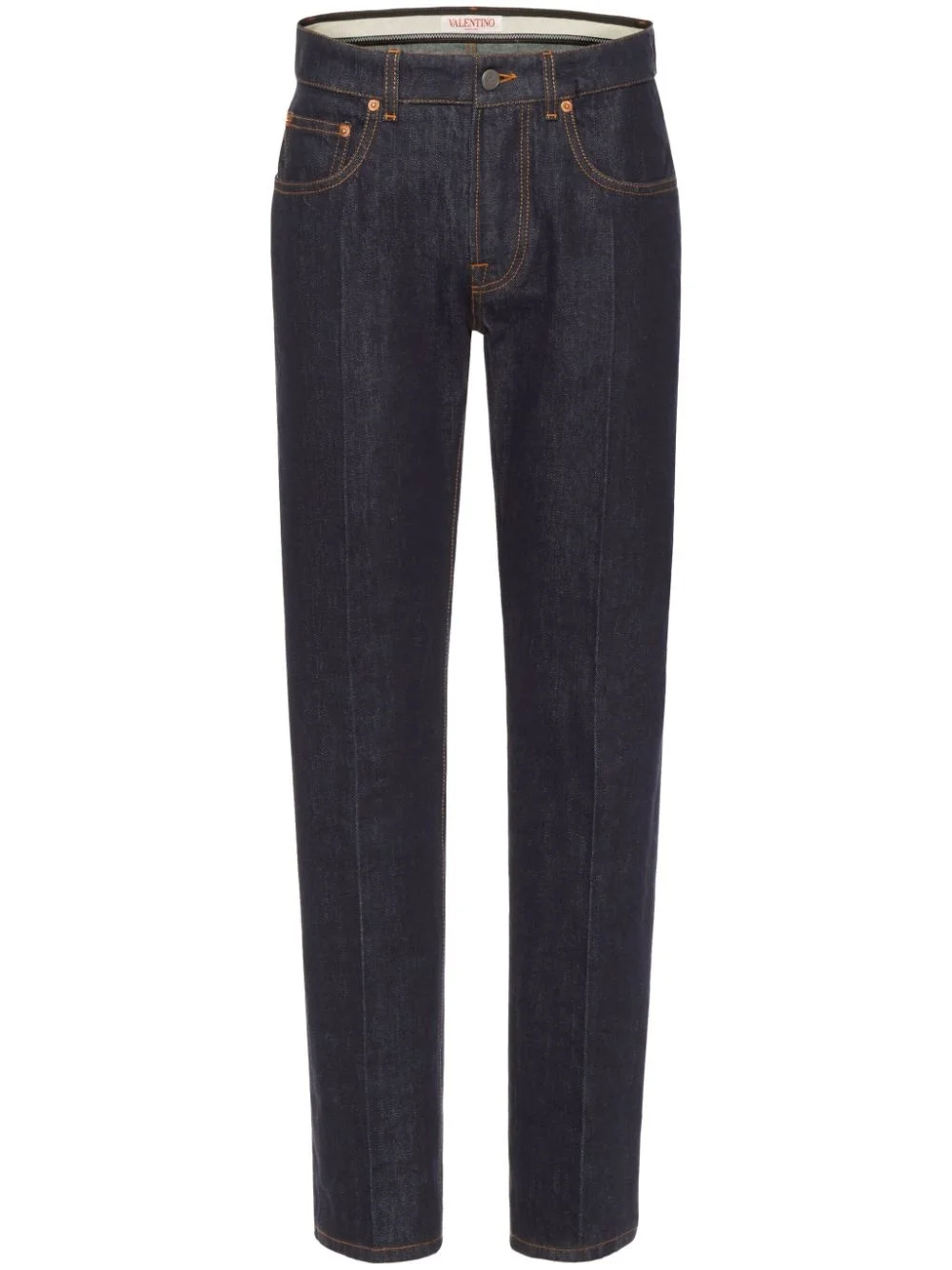 logo-applique tapered-leg jeans From the dark-blue wash down to the cropped cut, these jeans from Valentino Garavani strike a sophisticated note. They’re made from rigid cotton-denim with a mid-rise waist and creased carrot-fit leg. Highlights - Valentino ready to wear - Navy blue - Cotton - Mid-rise - Belt loops - Front button and zip fastening - Classic five pockets - Logo patch to the rear - Slim cut - Cropped - The full look includes valentino garavani accessories. Made in Italy Composition Outer: Cotton 100% Lining: Cotton 91%, Linen/Flax 9% Washing instructions Read Manufacturer Guidelines