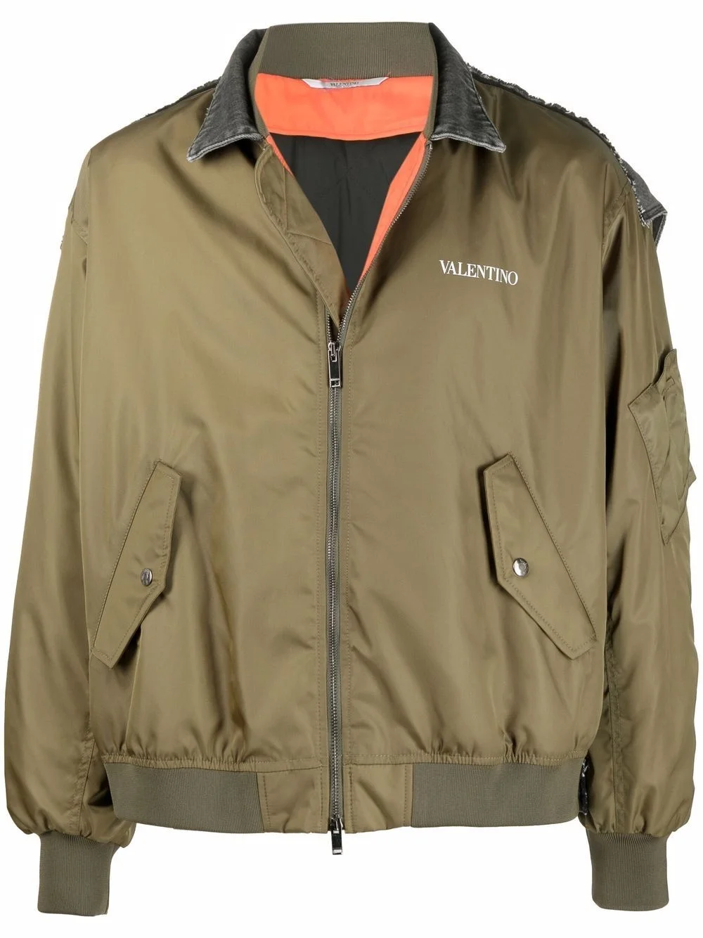 logo-print bomber jacket The Valentino Garavani DNA has always been about timeless and impeccable style. And a fine example of that is this green bomber jacket, designed in a mix of nylon and denim and detailed with the brand's logo on the chest. Highlights - Valentino ready to wear - Green - Cotton/calf leather - Logo print at the chest - Contrasting panel detail - Classic collar - Front zip fastening - Two side button-fastening pockets - Long sleeves - Straight hem Made in Italy Composition Outer: Cotton 100%, Calf Leather 100%, Polyamide 100% Lining: Polyester 100% SIZE & FIT Model measurements Height 6 ft 2 in(1.89 m) Bust/Chest 35.43 in(90 cm) Hips 36.61 in(93 cm) Waist 28.74 in(73 cm) FittingInformation This piece fits true to size. We recommend you get your regular size Cut for a loose fit Made with a mid-weight non-stretch fabric Washing instructions Hand Wash