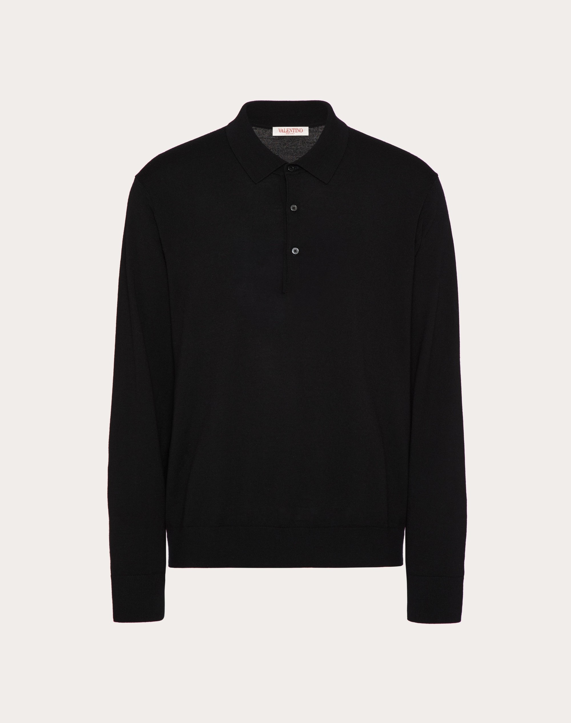 Valentino long-sleeved wool polo shirt with VLogo Signature embroidery - Slim fit Fineness: 18 - VLogo Signature embroidery on bottom - Composition: 100% Wool - Length: 68 cm / 26.7 in. from the back of the neck in a size M - The model is 187 cm / 6'1" tall and wears a size M - Made in Italy The look of the model is completed by a Valentino Garavani The Bold Edition Bag and Valentino Garavani Valentino Garavani Gentleglam Shoes. Product code: 5V0KP03JAH5_0NO