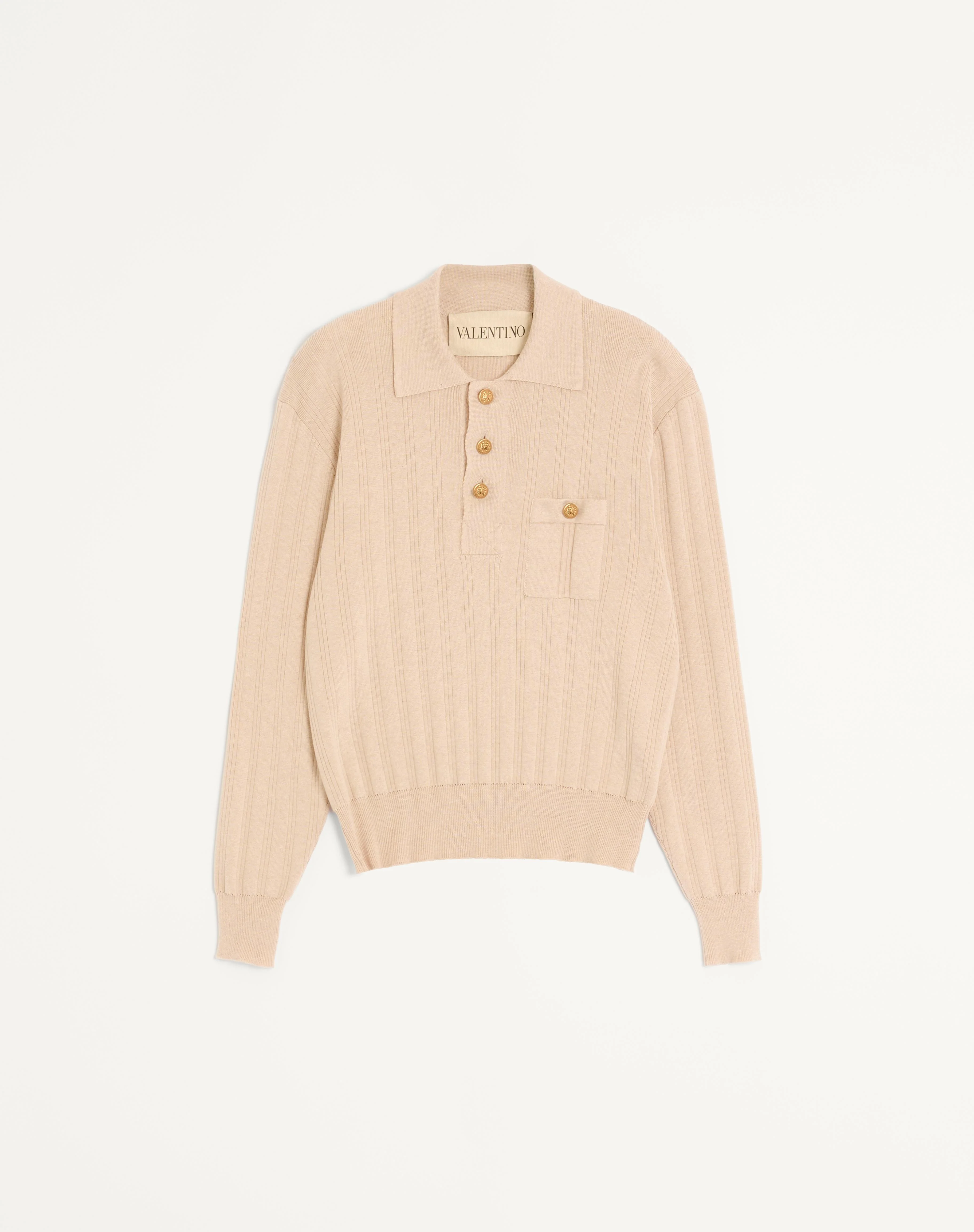 Valentino long-sleeved polo shirt in ribbed cotton - Regular fit - 14-gauge knit - One pocket on the left breast as worn - Composition: 100% Cotton - Length: 65 cm / 25.6 in. from the back of the neck in a size M - The model is 187 cm / 6'1" tall and wears a size M - Made in Italy The look of the model is completed by a Valentino Garavani 9TO5 Bag and Valentino Garavani VLogo Signature Shoes. Product code: 7V3KP03TB0L_581
