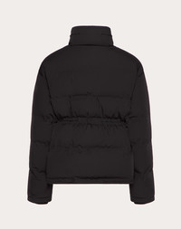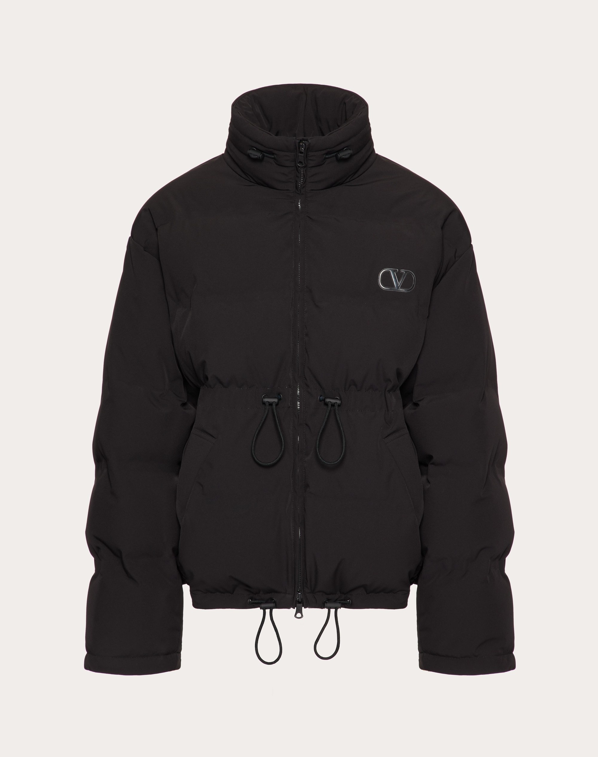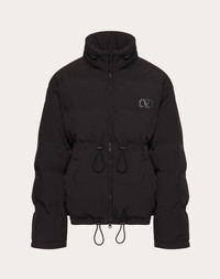 Matte nylon down jacket with hood and VLogo Signature patch - Regular fit - Lined - Embroidered VLogo Signature patch on the left breast as worn - Inside rubber label with Valentino landscape animation - Zipper closure - Two side pockets - Drawstring at the waist and bottom - Composition: 51% Polyamide, 42% Polyester, 7% Elastane - Padding composition: 90% Down, 10% Feathers - Length: 69 cm / 27.3 in. from the back of the neck in Italian size 46 - The model is 187 cm / 6'1" tall and wears an Italian size 50 - Made in Italy The look of the model is completed by a Valentino Garavani VLTN Bag and Valentino Garavani MS2960 Shoes. Product code: 2V3CNC00944_0NO