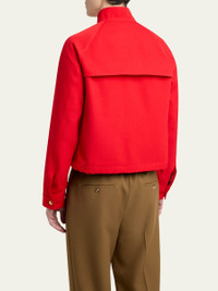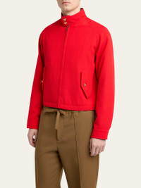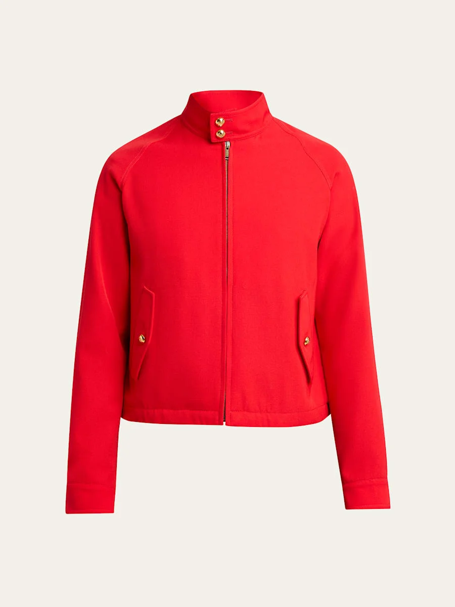Valentino Garavani blouson in premium wool with gold-tone metal branded buttons Stand collar; button closure Buttoned hip flap pockets Full-zip front Long sleeves Single-button cuffs Storm flap Wool Made in Italy Online Inquiries: BGS21_ND2AP| Store Inquiries: #5000905