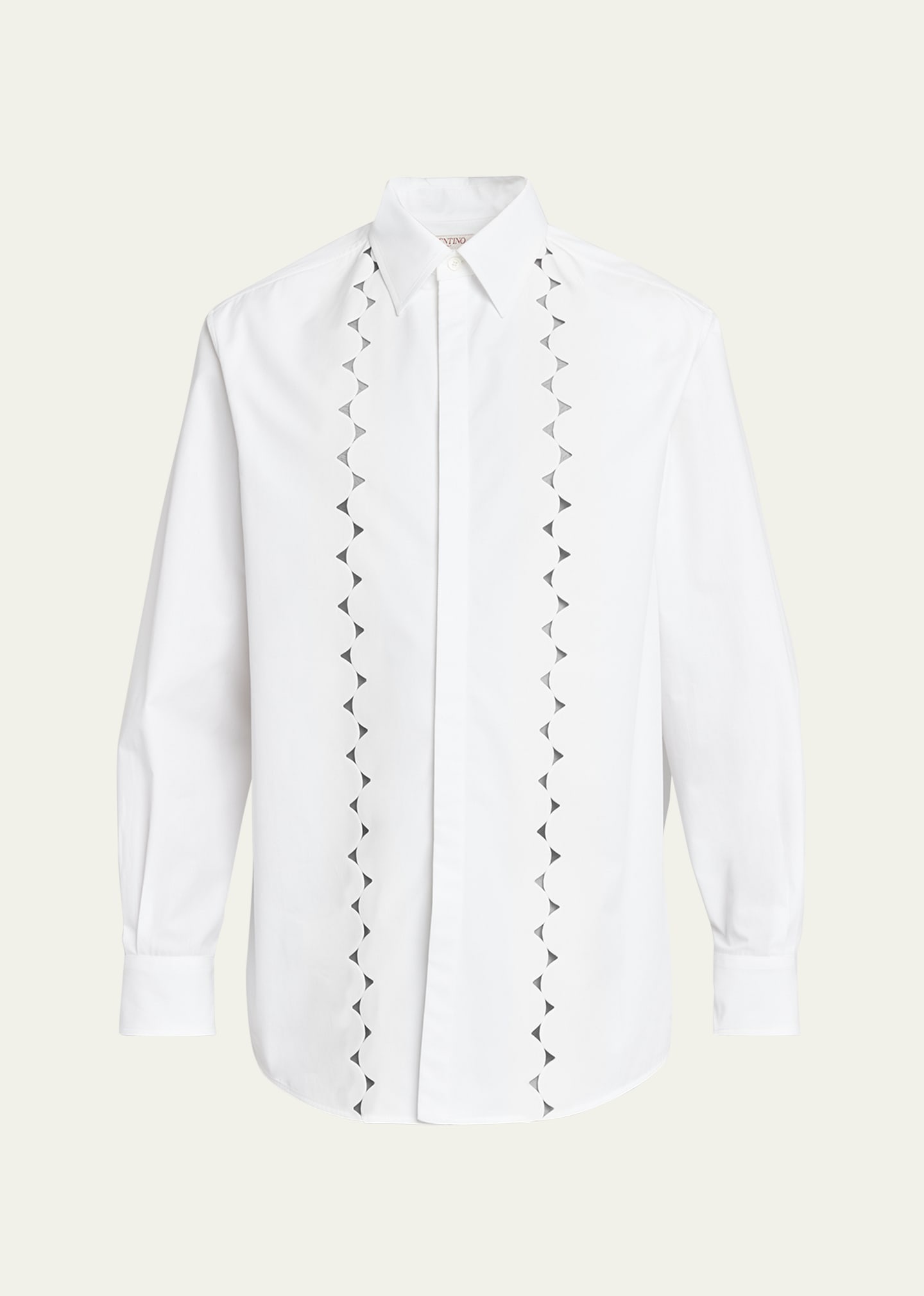Valentino Garavani shirt crafted from cotton poplin Features scallped broderie anglaise cutwork on front Point collar Concealed button placket Long sleeves Mitered barrel cuffs Box pleat at back yoke Curved hem Professional cleaning recommended Made in Italy Model is 6'1"/185cm. Online Inquiries: BGS21_NBYL9| Store Inquiries: #4743999