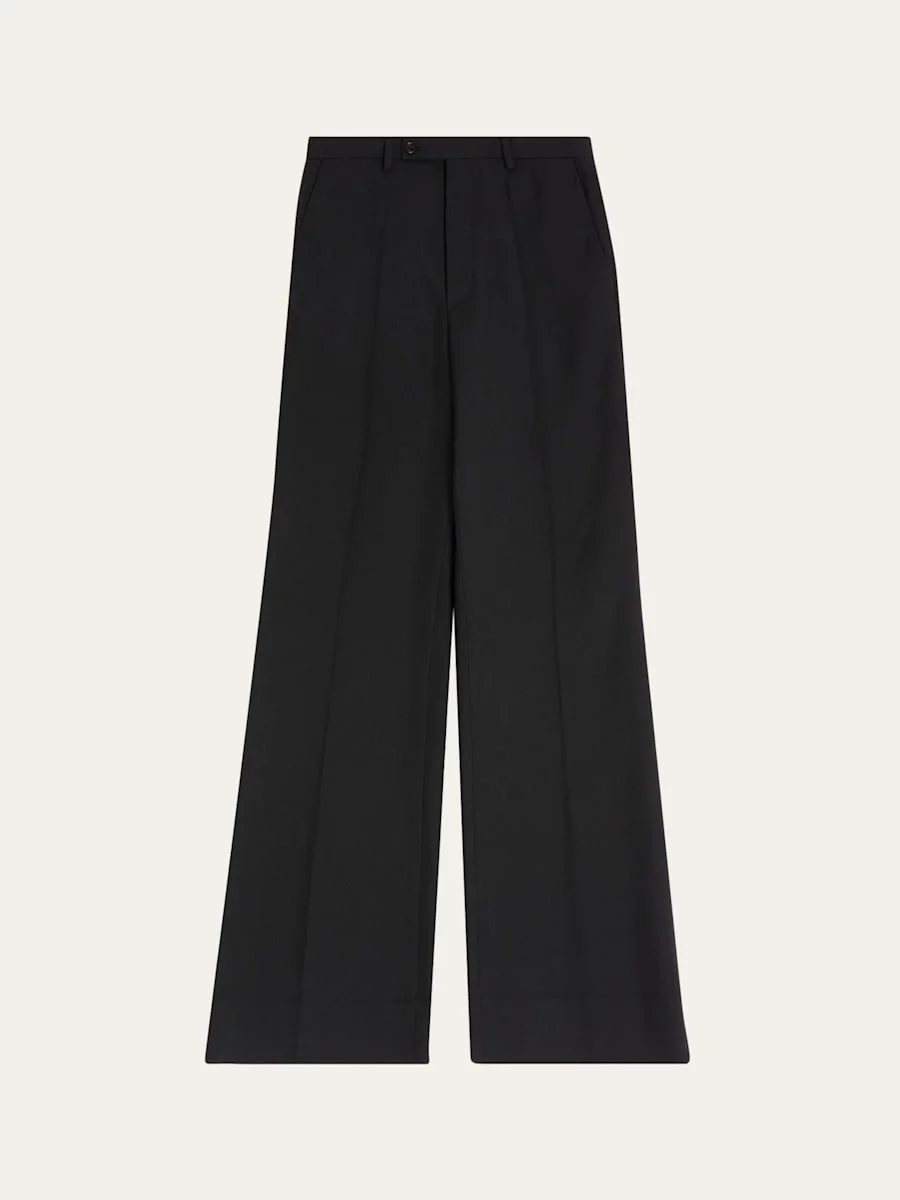 Valentino Garavani pants are defined by a wide, flared leg for a sleek and stylish silhouette Regular rise Flat front Side slip pockets Back welt pockets Classic fit through flared bootcut legs Full length Extended button-zip front; belt loops Polyester/wool/cotton Made in Italy Online Inquiries: BGS21_NDNV3| Store Inquiries: #5056482