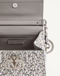 Mini Valentino Garavani VSLING handbag entirely covered in rhinestones with VLogo Signature closure. - The bag can be worn crossbody thanks to its extendable shoulder strap, or carried by hand thanks to its handle. - Palladium-finish hardware - Magnetic closure with logo covered in Swarovski® crystals - Adjustable Leather shoulder strap - Protective feet - Nappa lining. Interior: open slip pocket - Drop Length: min 45 cm / 17.7 in. - max 59 cm / 23.2 in. - Dimensions: W19xH13xD9 cm / W7.5xH5.1xD3.5 in. - Made in Italy This product contains magnets. Please consider if this product will be worn within 15 cm from any implanted device. Any concerns please contact your healthcare professional. Product code: 6W2B0G97VFF_72A