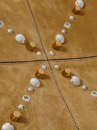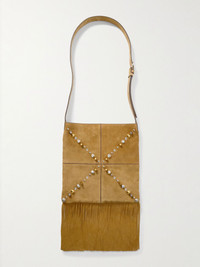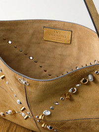 Valentino Garavani delves into the archives for SS25, resulting in a maximalist collection filled with plenty of ‘70s references. Made in Italy from panels of supple suede, this shoulder bag is embellished with gold and silver-tone studs that are arranged to create a cross and is trimmed with fringing. It'll fit your phone, paperback and sunglasses. Details & Care - Brown suede (Calf) - Adjustable shoulder strap - Suede lining - Comes with a dust bag
