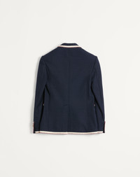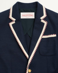 Valentino single-breasted jersey cotton jacket with torchon piping - Regular fit - Lined - Torchon piping - Two front patch pockets - One pocket on the left breast as worn - Composition: 51% Cotton, 41% Linen, 6% Polyamide, 2% Elastane - Lining: 55% Viscose, 45% Polyester - Length: 73 cm / 28.7 in. from the back of the neck in an Italian size 46 - The model is 187 cm / 6'1" tall and wears an Italian size 46 - Made in Italy The look of the model is completed by a Valentino Garavani Nellcote Bag and Valentino Garavani VLogo Signature Shoes. Product code: 6V3CEG75AMR_598