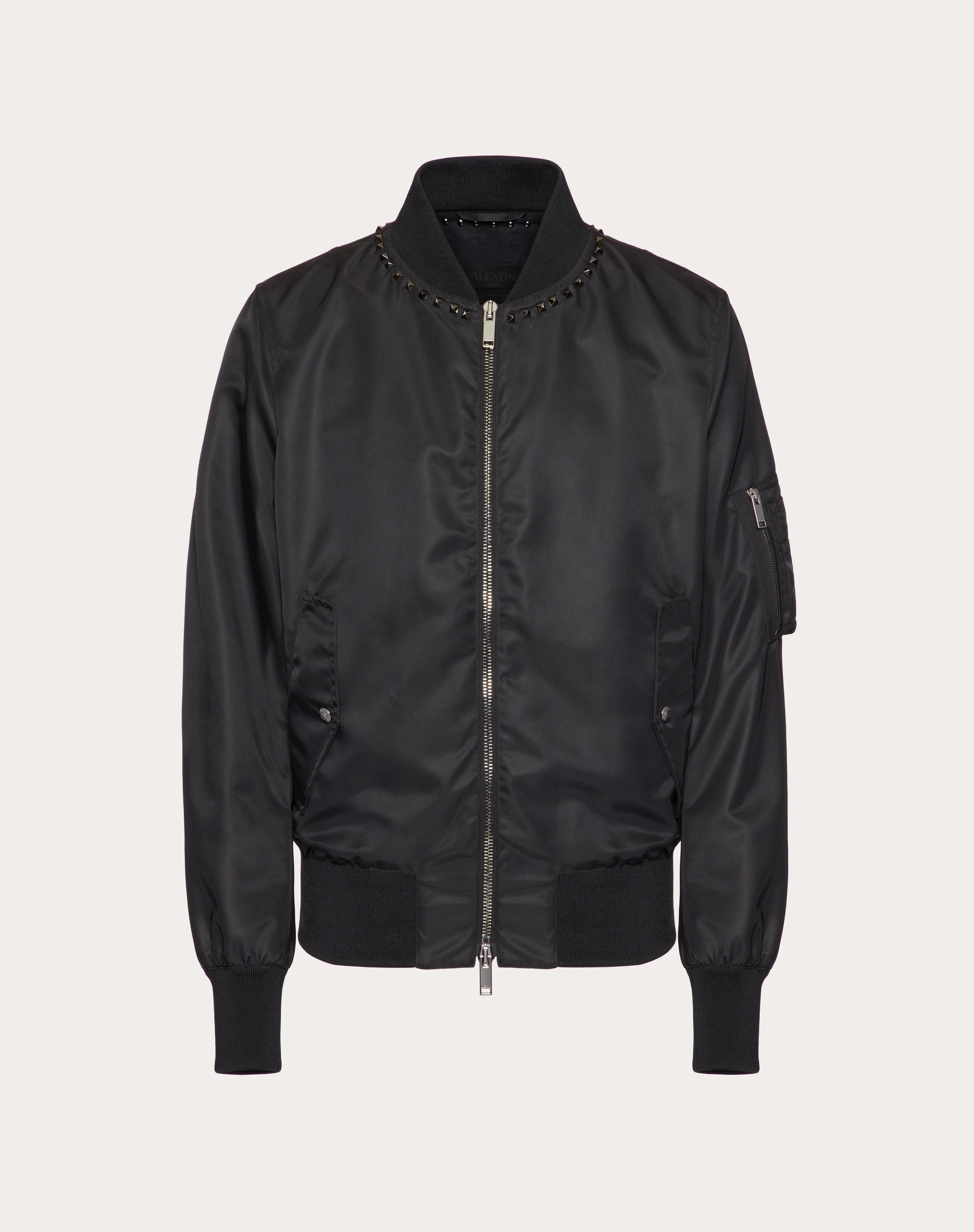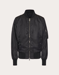 Valentino Nylon bomber jacket with Black Untitled studs on the neckline - Regular fit - Lined - Black Untitled studs applied along the neckline - Ribbed elasticated trim - Zipper closure - Two side pockets with flap and button fastening - Small zipper pocket on the left side sleeve as worn - Composition: 100% Polyamide - Lining: 100% Cupro - Length: 65 cm / 25.6 in. from back of the neck in an Italian size 46 - The model is 187 cm / 6'1" tall and wears an Italian size 46 - Made in Italy The look of the model is completed by Valentino Garavani VLogo Pace Shoes. Product code: 4V3CI1702KP_0NO