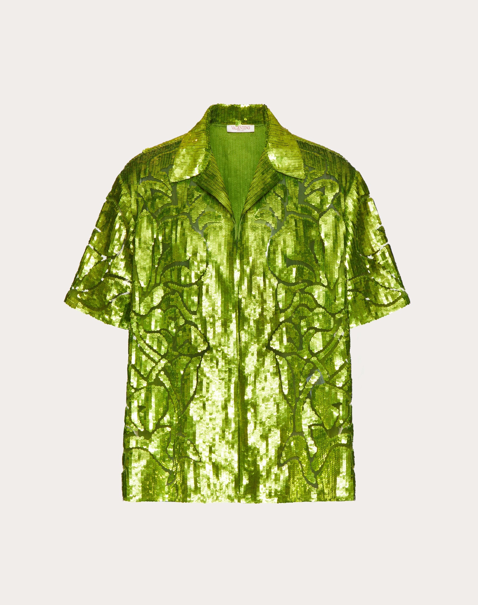 Bowling shirt in nylon with sequins and floral cut-out embroidery on the front and sleeves. - Boxy fit - All-over sequins - Floral cut-out embroidery on front and sleeves - Solid back - Concealed button fastening - Composition: 100% Polyamide - Length: 76 cm/29.9 in. from the back of the neckline for Italian size 48 - The model is 187 cm/6’2” tall and is wearing an Italian size 48 - Made in Italy Product Code VAAC808DT_CJ5