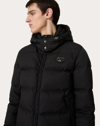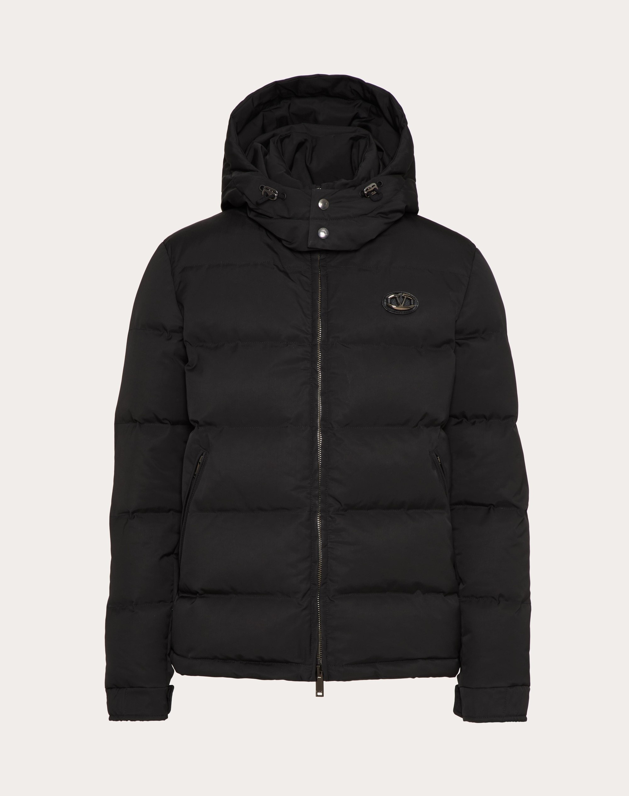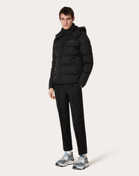 NYLON HOODED DOWN JACKET WITH LEATHER PATCH AND VLOGO SIGNATURE